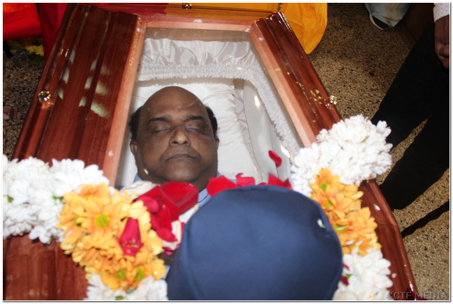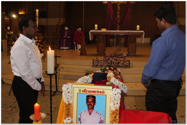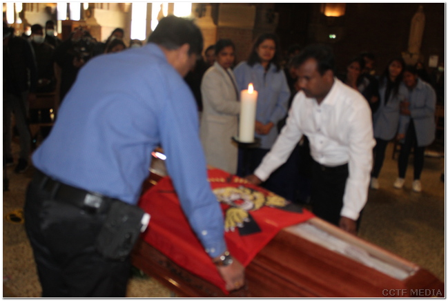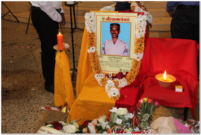 பொதுச்சுடர் ஏற்றப்பட்டதைத் தொடர்ந்து அன்னாரின் புகழுடலுக்கு அவரோடு தாயகத்தில் பணியாற்றிய தமிழீழ காவல்துறை முன்னாள் உறுப்பினர்கள் தமிழீழத் தேசியக்கொடி போர்த்தி மதிப்பளிப்புச் செலுத்தினர்.
