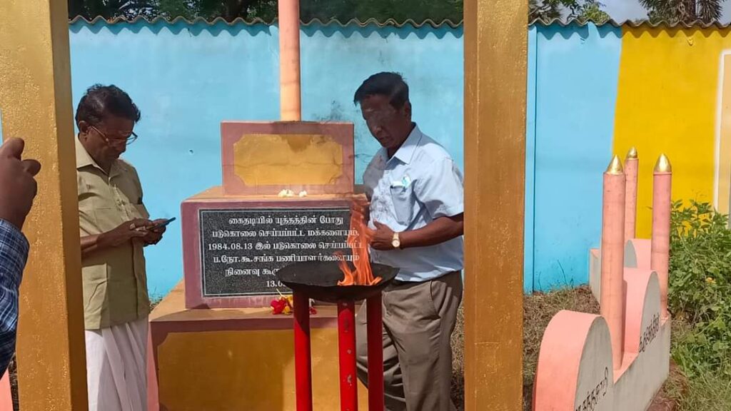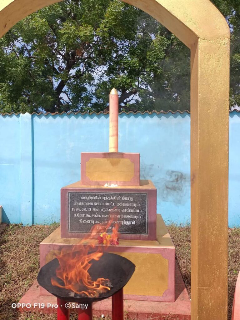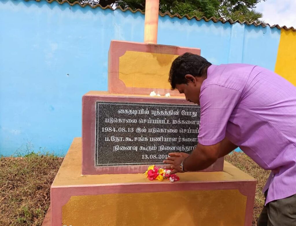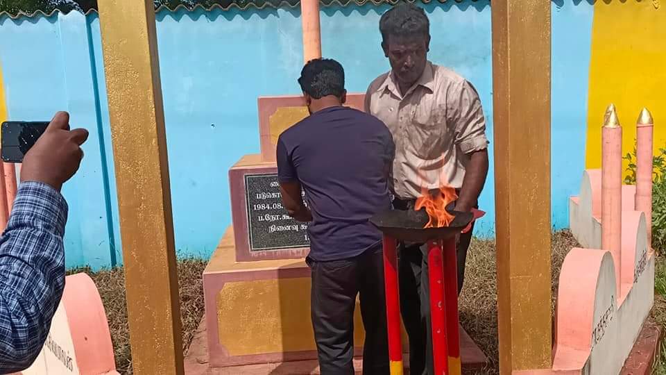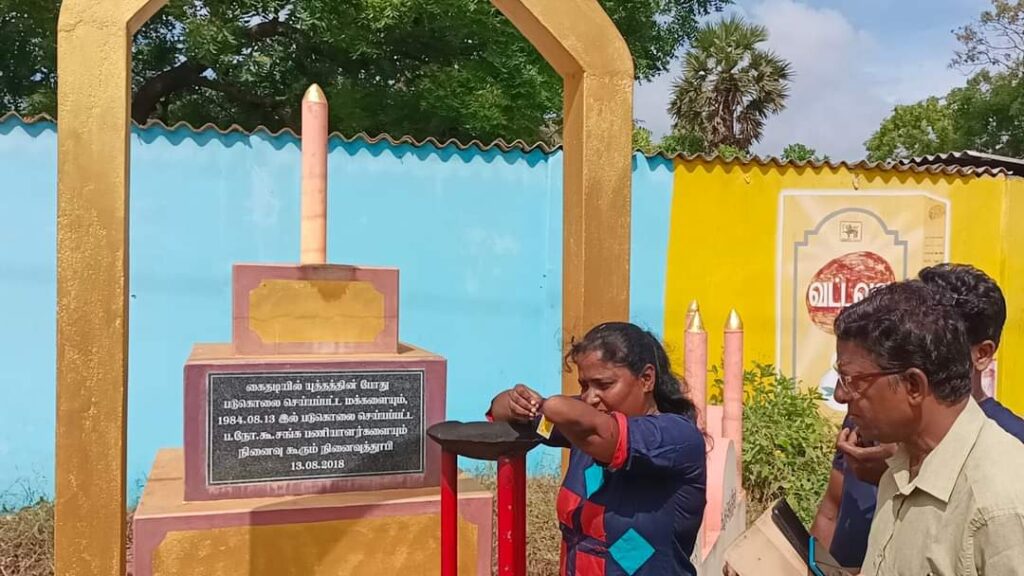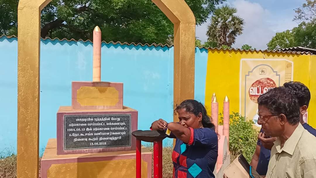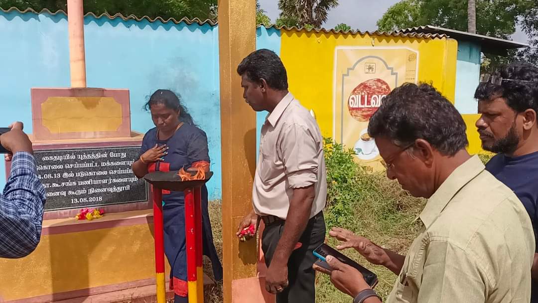 ஈழச்செய்திகள்சிறப்பு செய்திகள் யாழ்.கைதடியில் மே18 வாரத்தின் ஆறாம் நாள் நினைவேந்தல்! By Admin - May 17, 2022 0 301 முள்ளிவாய்க்கால் நினைவேந்தல் வாரத்தின் ஆறாம் நாளான இன்று செவ்வாய்க்கிழமை கைதடிப் பகுதியில் 13.08.1984 அன்று படுகொலை செய்யப்பட்ட பலநோக்குக் கூட்டுறவுச் சங்கப் பணியாளர்களின் நினைவாக அமைக்கப்பட்டுள்ள நினைவுத்தூபியின் முன்பாக இடம்பெற்றது.