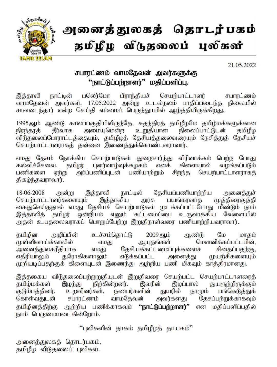 இத்தாலி பலெர்மோவில் 17.05.2022 அன்று சாவடைந்த, தமிழ்த் தேசிய செயற்பாட்டாளர் அமரர் சபாரட்ணம் வாமதேவன் அவர்களுக்கு தமிழீழ விடுதலைப் புலிகள் அனைத்துலகத் தொடர்பகத்தினால் “நாட்டுப்பற்றாளர்” என மதிப்பளிக்கப்பட்டு, வீரவணக்க நிகழ்வு 23.05.2022 அன்று காலை 09:00 மணிக்கு நடைபெற்றது.
