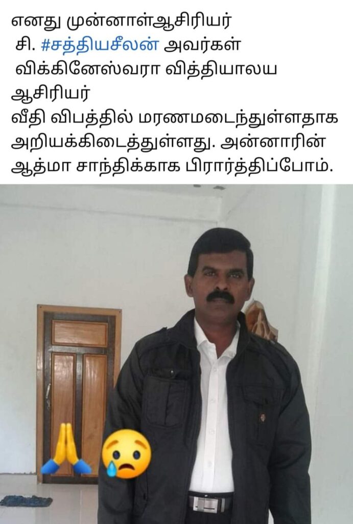 முல்லைத்தீவு முத்தையன் கட்டு வலதுகரை ஆரம்ப பிரிவு பாடசாலையான முத்துவிநாயகர் தமிழ் வித்தியாலய அதிபர் திரு.கந்தையா.சத்தியசீலன் அவர்களே இவ்வாறு உயிரிழந்துள்ளார்,