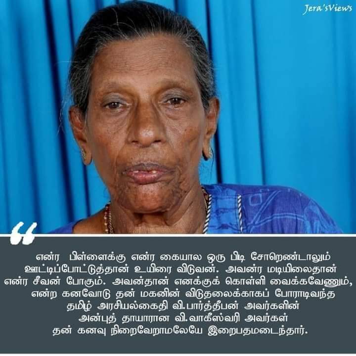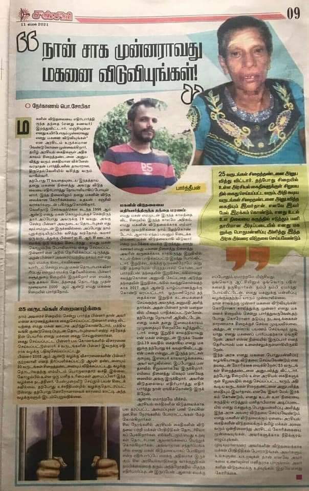 26 ஆண்டுகளாக சிறையில் வாடிக்கொண்டிருக்கும் தமிழ் அரசியல் கைதி விக்கினேஸ்வரநாதன் பார்த்தீபனின் தாயாரான