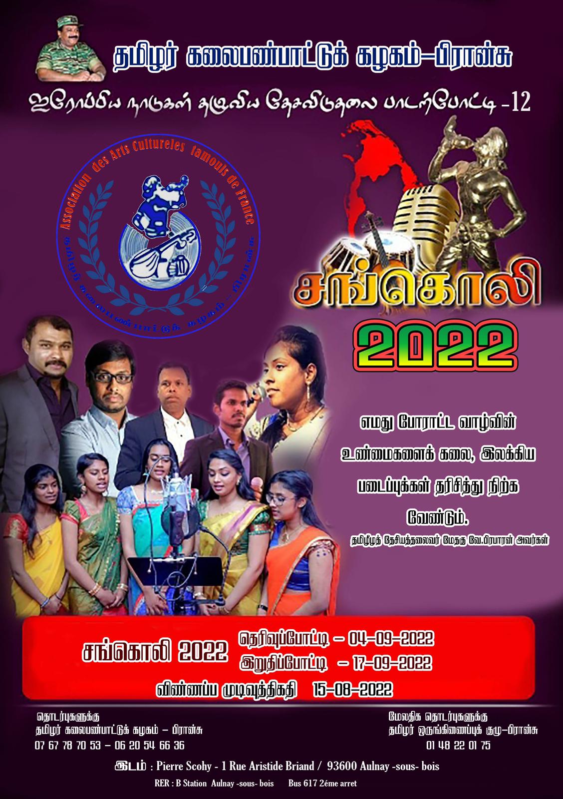 பிரான்சு தமிழர் கலைபண்பாட்டுக்கழகம் ஐரோப்பிய ரீதியில் நடாத்தும் சங்கொலி தேச விடுதலைப் பாடல் போட்டி 2022 இற்கான விண்ணப்பங்கள் கோரப்பட்டுள்ளன.