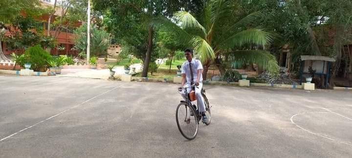 துவிச்சக்கர வண்டியில் மோட்டார் பொருத்தியும், மீள் சுழற்சி பொருட்களை பயன்படுத்தியும் அதனை கண்டு பிடித்துள்ளார்.