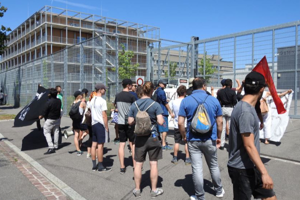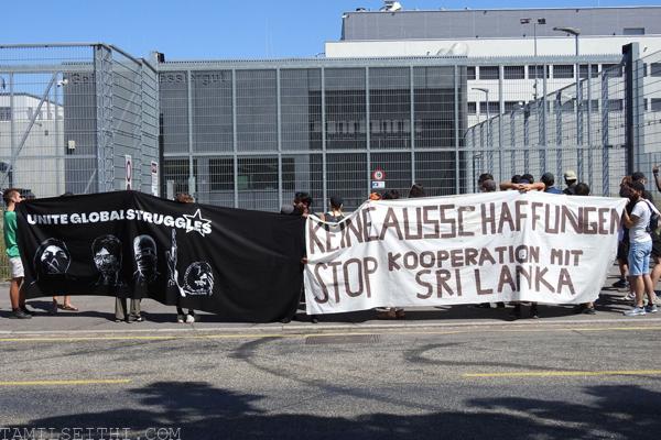 பேசலில் அமைந்திருக்கும் Bässlergut நாடுகடத்தல் சிறை ஒன்றின் முன் பதாகைகளுடன் கூடிய போராட்டக்காரர்கள் பலர், சுவிட்சர்லாந்து தமிழர்களை நாடுகடத்துதற்கெதிராக கோஷம் எழுப்பினார்கள்.