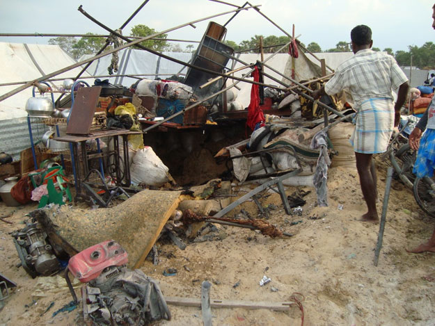 நாலு புள்ளைகள், மனுசி. ஒருத்தரும் மிஞ்சேலை. செல் அடிக்கிறாங்கள் எண்டு பங்கருக்க போயிருக்கிறாங்கள். ஆனா குண்டு நேரா எங்கட பங்கருக்க விழுந்திருக்கு. அங்க நிண்டவ என்னோட சேர்ந்து சிதறின உடம்புகளை பொறுக்கித் தந்திச்சினம். ஒரு ‘பொடியைக்’ கூட முழுசா எடுக்க முடியேலை. ஒரு குண்டு என்ர பிள்ளையள், மனுசி, என்ர சந்தோசம் எல்லாத்தையும் சிதற வைச்சிட்டுது.