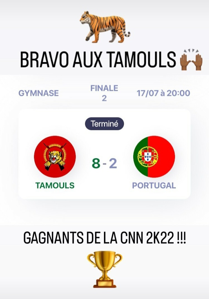 கால் இறுதிப்போட்டியில் செனகலுடன் மேதிய தமிழீழ அணி 4 – 0 கோல்களைப் போட்டும், அரை இறுதி தெரிவாகி, தம்முடன் மோதிய மொறோக்கோ அணிக்கு 6 கோல்களை கொடுத்து 1 கோல்களையும் பெற்றதோடு, இறுதிப்போட்டிக்கு தெரிவான தமிழீழ அணி தம்முடன் போட்டிக்கு வந்த போத்துகல் அணிக்கு 8 கோல்களை அடித்து போர்த்துக்கலிடமிருந்து 2 கோல்களையும் பெற்றுக்கொண்டனர். இறுதியில் அபாரவெற்றியை பெற்ற தமிழீழ அணியினை சிநேகபூர்வமாக அனைத்து நாட்டுவீரர்களும் கைகளை கொடுத்து பாராட்டியிருந்தனர். அறிவிப்பாளர் தமிழ் தமிழ் என்று அறிவிக்கும் போது ஒவ்வொரு வெற்றிபந்தை அடிக்கும்போது அனைத்து மக்களும் தமிழீழ அணிக்கு காட்டிய உற்சாகம், கரகோசம் எமது வீரர்களுக்கு பெரும் பலத்தைக் கொடுத்திருந்தது. தமிழர் ஒருங்கிணைப்புக்குழுவின் தமிழர் விளையாட்டுத்துறையும் ,ஈழத்தமிழர் உதைபந்தாட்டச் சம்மேன ஆதரவோடும் பங்களிப்புடனும் தமிழீழ தேசத்திற்கும், எமது வீரர்களுக்கும் விளையாட்டுத்துறையின் ஊடாக பெயரையும், புகழையும் மீண்டும் பெற்றுத்தந்திருக்கின்றனர்.