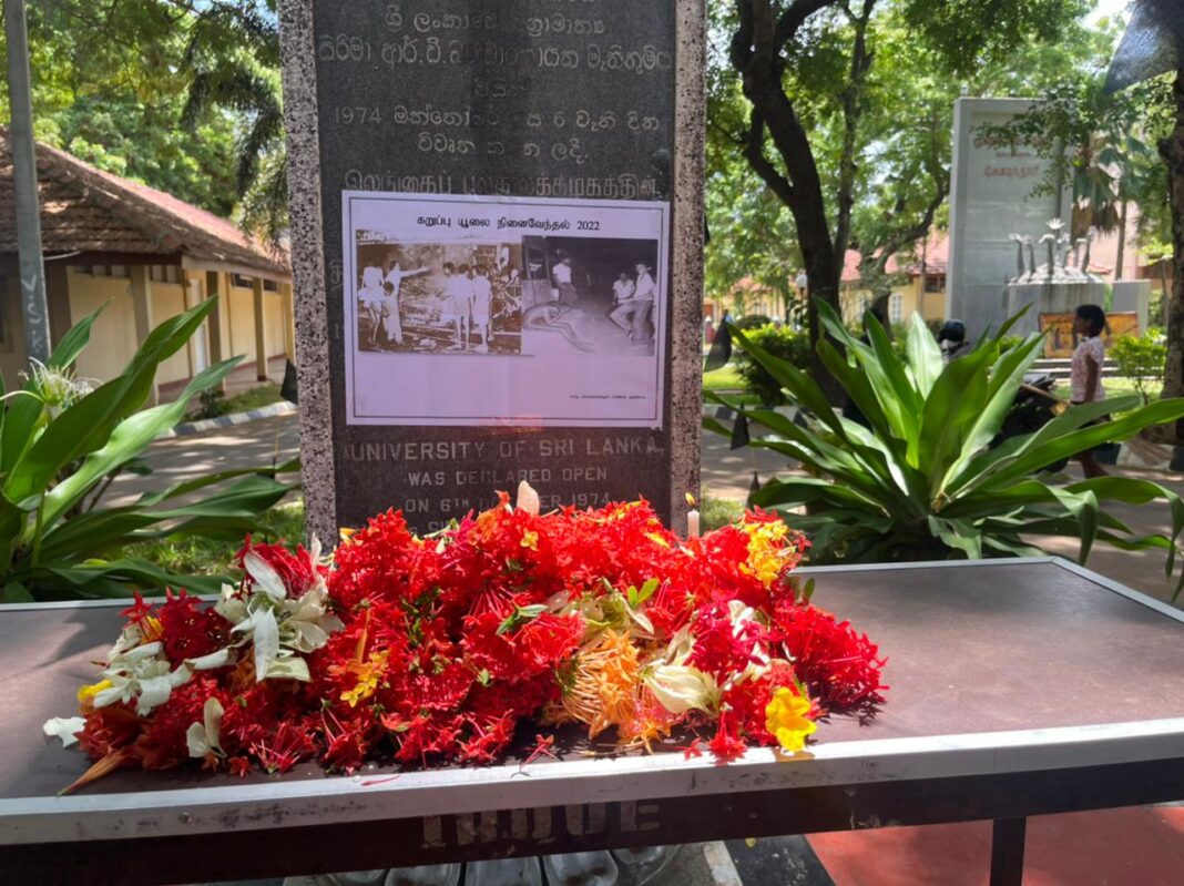 யாழ்ப்பாணப்பல்கலைக்கழக மாணவர் ஒன்றியத்தினால் இன்று காலை யாழ் பல்கலைக்கழகத்தின் பிரதான நுழைவாயிலில் அமைந்துள்ள தூபியில் கறுப்பு ஜூலை நினைவுதினம் உணர்வுபூர்வமாக அனுஷ்டிக்கப்பட்டது.