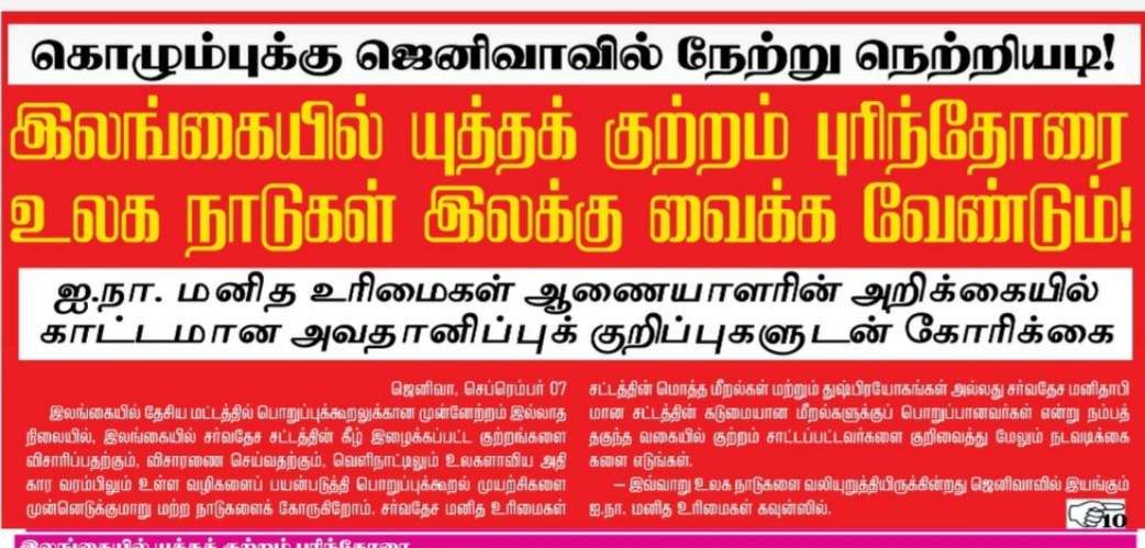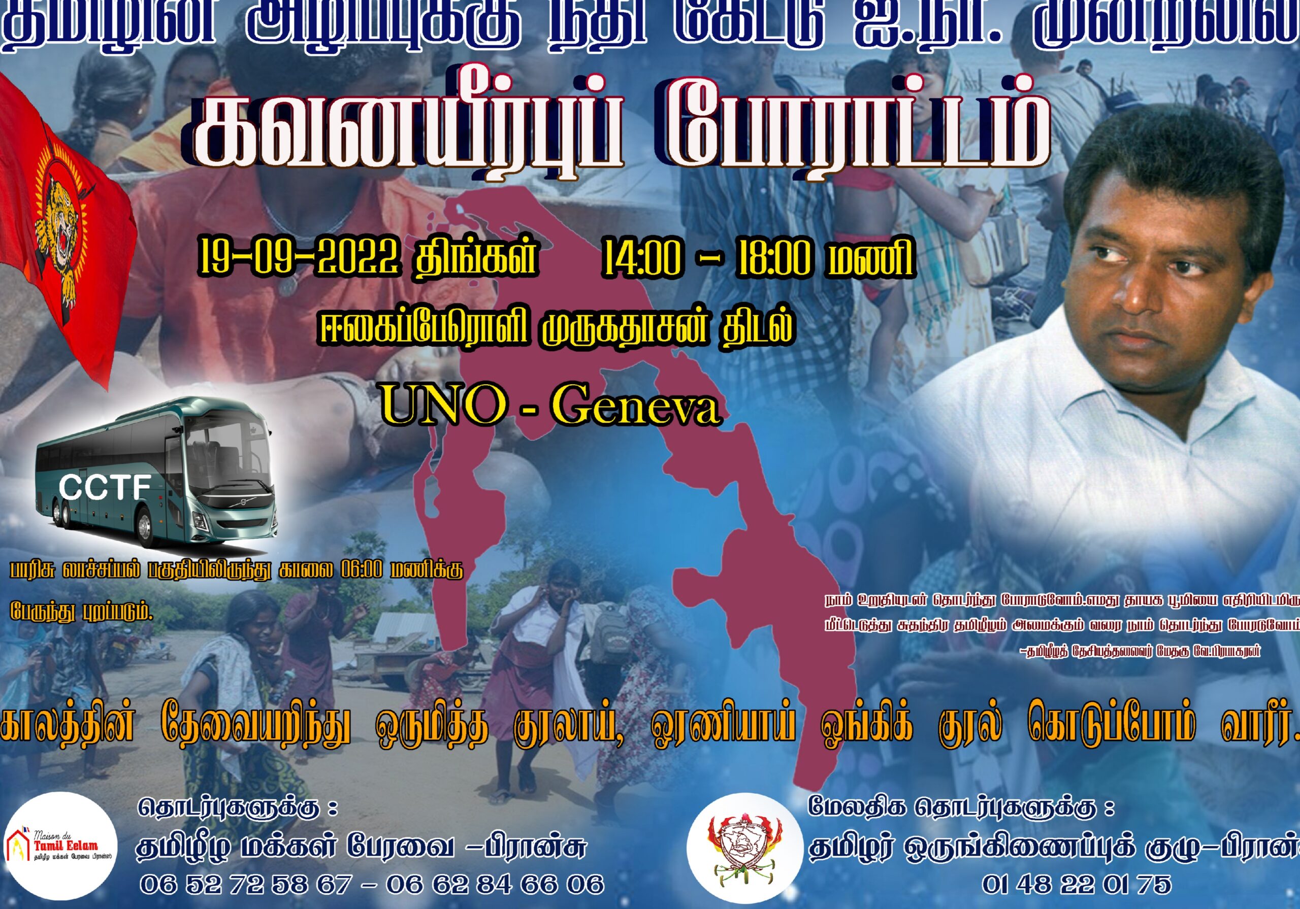 இந்த வகையில் வரும்19.09.2022 திங்கள் செனீவா முருகதாசன் திடலில் நடைபெறும் கவனயீர்ப்புப் போராட்டம் காலத்தின் உலகத்தின் பார்வையில் அடுத்த மைல் கல்லாகவே பார்க்கப்படுகின்றது. நாம் அனைவரும் இக்கவனயீர்ப்புப் போராட்டத்தில் பங்கெடுப்போமாக! எம்மவர்களையும் பங்கெடுக்க வைப்போமாக! – பரப்புரை