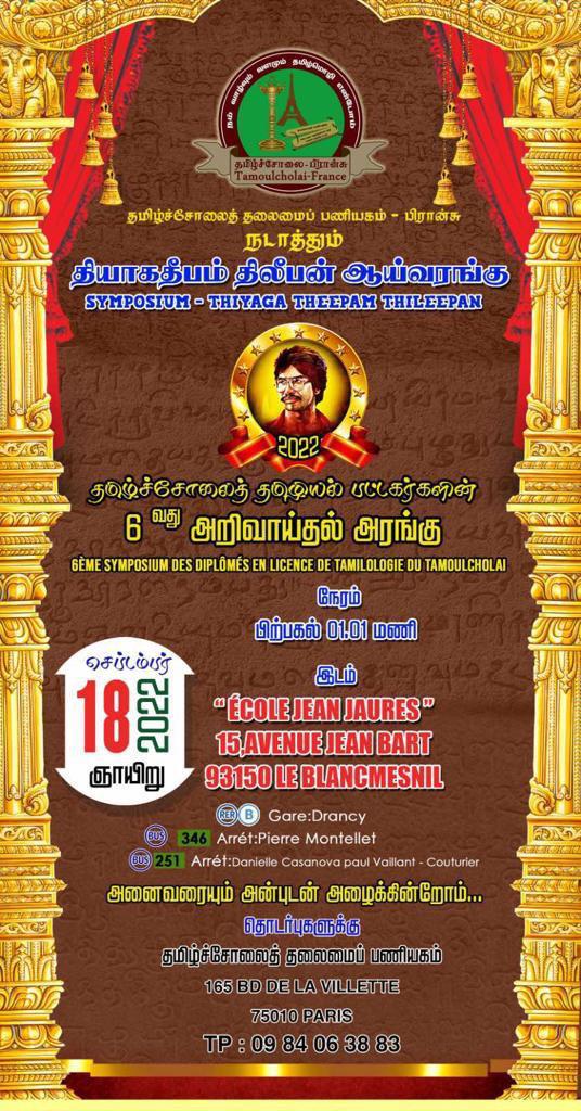 சிறப்பு செய்திகள்புலத்துச்செய்திகள் பிரான்சில் 6 ஆவது தியாக தீபம் திலீபன் அறிவாய்தல் அரங்கு! By Admin - September 12, 2022 0 347 பிரான்சில் தமிழ்ச்சோலைத் தலைமைப் பணியகம் பிரான்சு 6 ஆவது தடவையாக நடாத்தும் தமிழ்ச்சோலைத் தமிழியல் பட்டகர்களின் தியாக தீபம் திலீபன் அறிவாய்தல் அரங்கு வரும் 18.09.2022 ஞாயிற்றுக்கிழமை பிற்பகல் 01.01 மணிக்கு le blanc mesnil பகுதியில் இடம்பெறவுள்ளது.