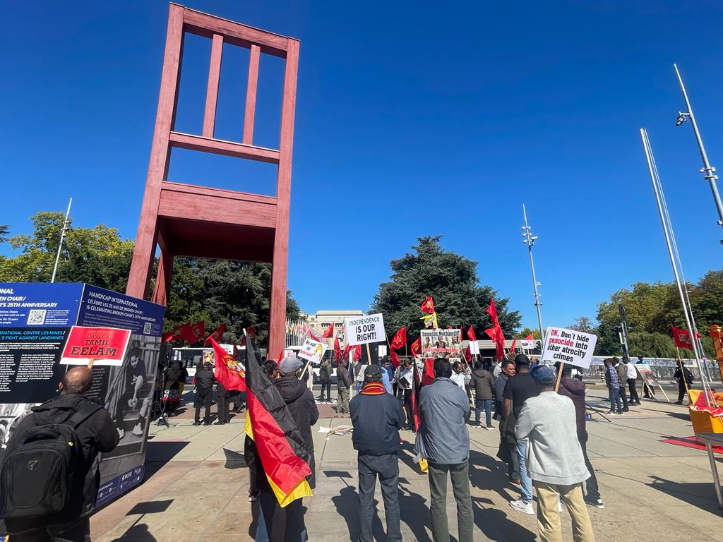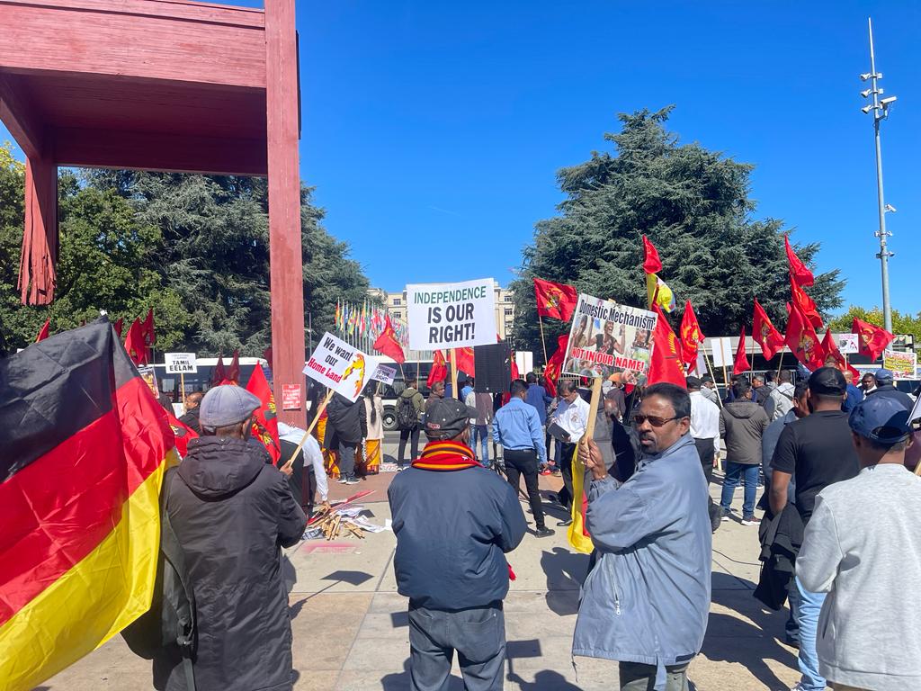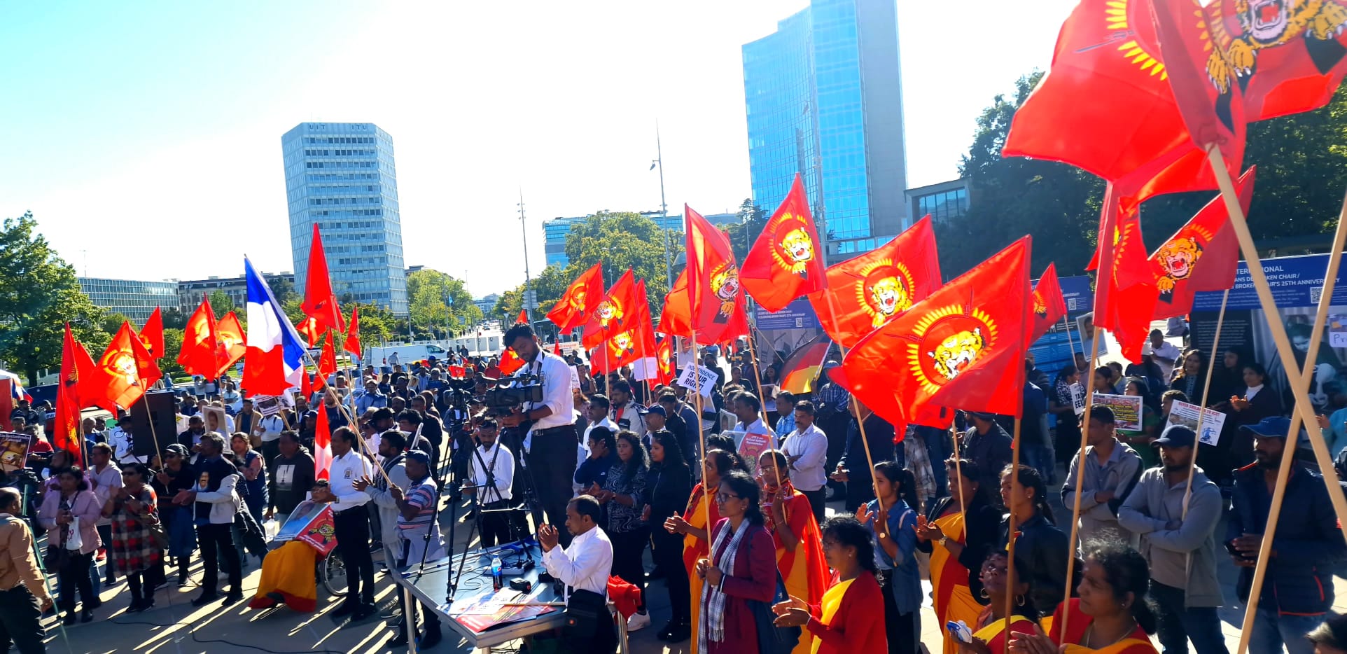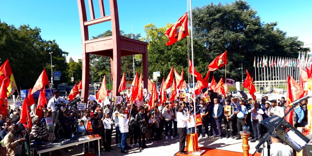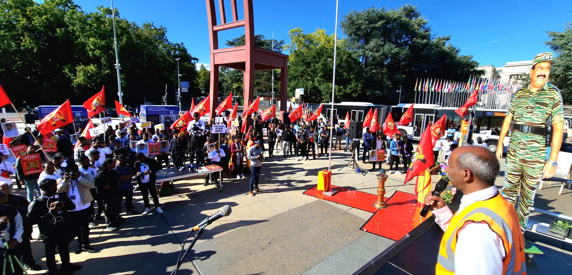 எங்களுக்கான நீதியை எங்களுக்குத் தாருங்கள் என்ற உரிமை முழக்கத்தோடு, சிறிலங்காப் பேரினவாத அரசினால் தொடர்ச்சியாக தமிழ்மக்கள் மீது மேற்கொள்ளப்பட்டுவரும் இன அழிப்பிற்கு நீதிகேட்டு ஐ.நா முன்றல் ஈகைப்பேரொளி முருகதாசன் திடலில் முன்னெடுக்கப்பட்ட கவனயீர்ப்புப் போராட்டத்தில் நூற்றுக்கணக்கான தமிழ்மக்கள் கலந்துகொண்டிருந்தனர்.