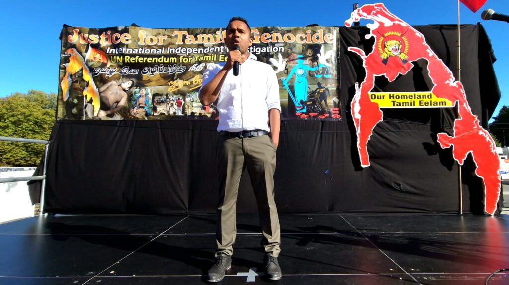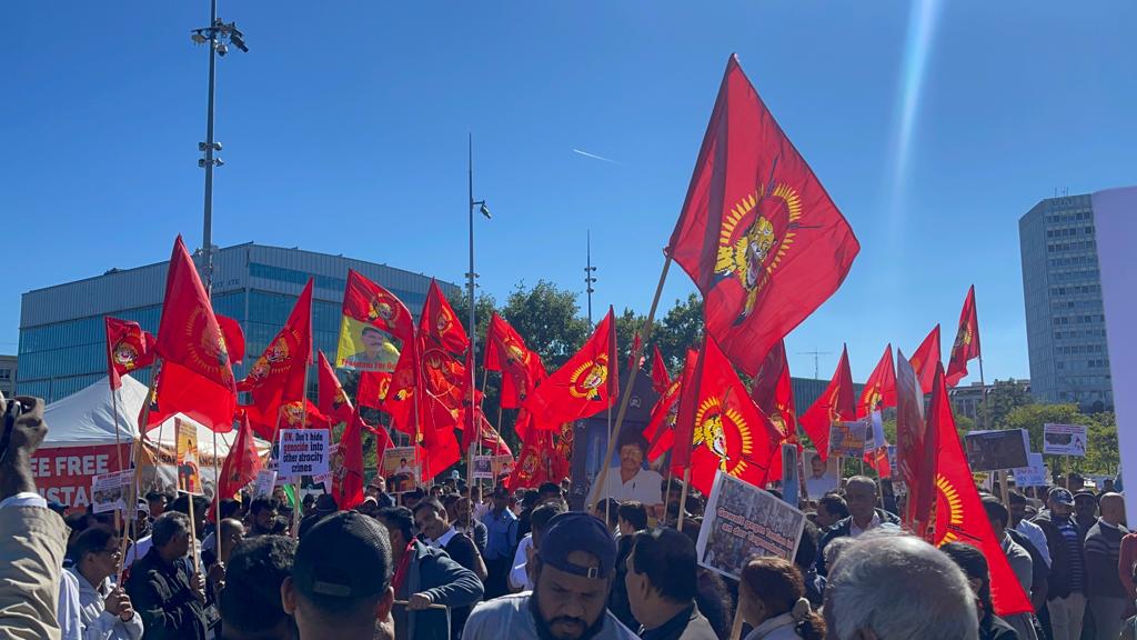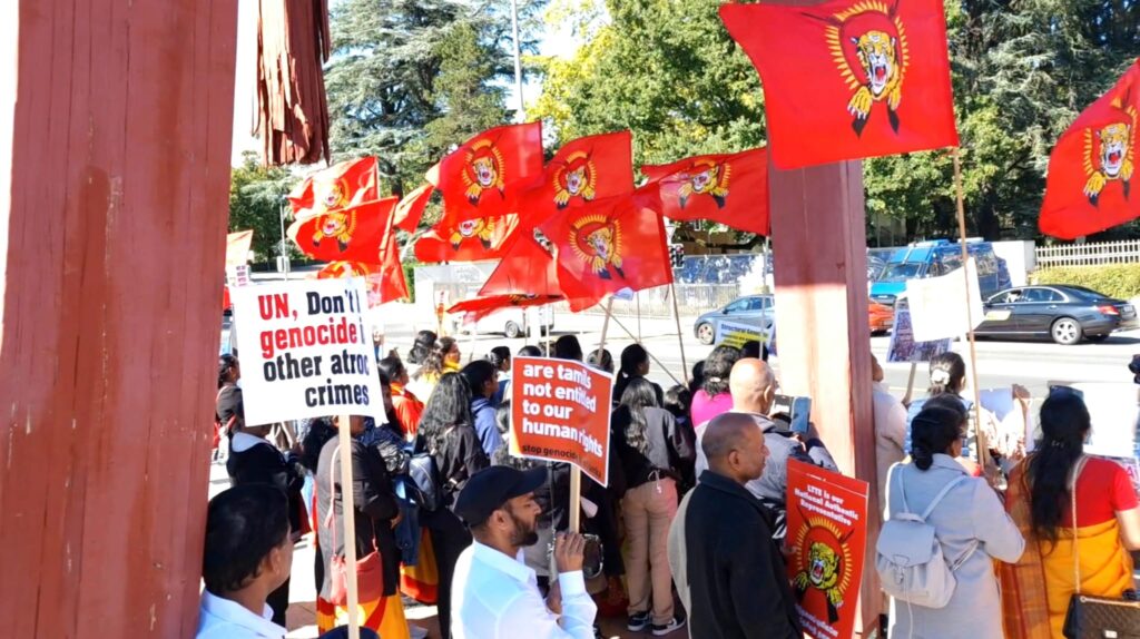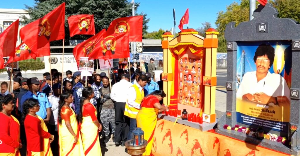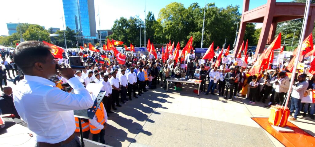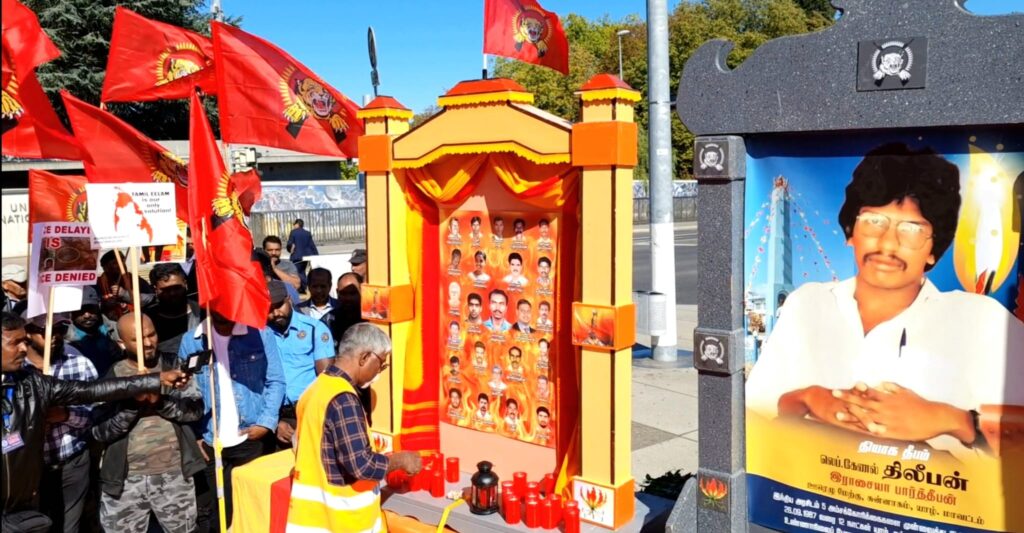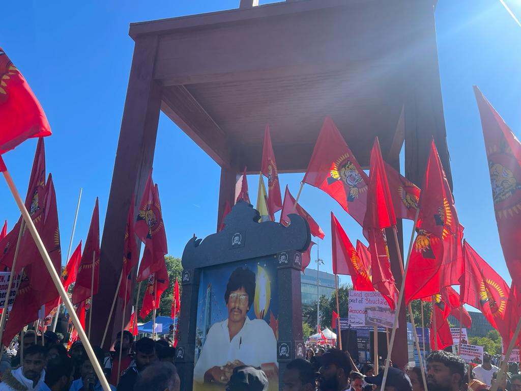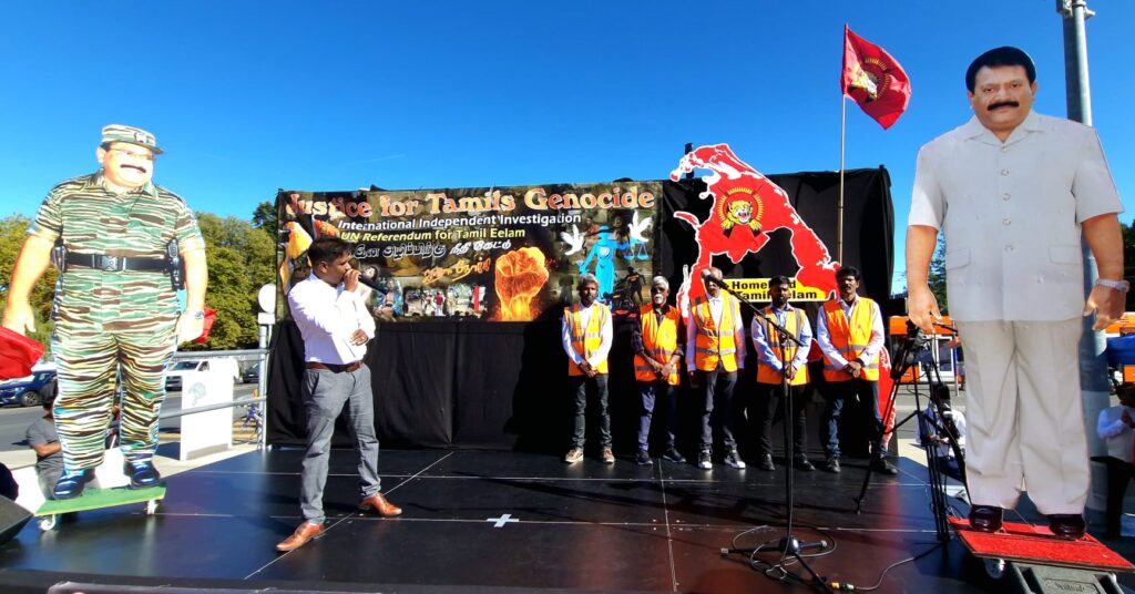 எங்களுக்கான நீதியை எங்களுக்குத் தாருங்கள் என்ற உரிமை முழக்கத்தோடு, சிறிலங்காப் பேரினவாத அரசினால் தொடர்ச்சியாக தமிழ்மக்கள் மீது மேற்கொள்ளப்பட்டுவரும் இன அழிப்பிற்கு நீதிகேட்டு ஐ.நா முன்றல் ஈகைப்பேரொளி முருகதாசன் திடலில் முன்னெடுக்கப்பட்ட கவனயீர்ப்புப் போராட்டத்தில் நூற்றுக்கணக்கான தமிழ்மக்கள் கலந்துகொண்டிருந்தனர்.