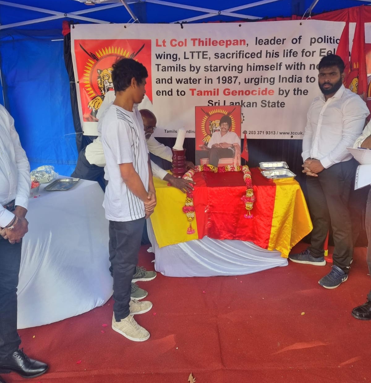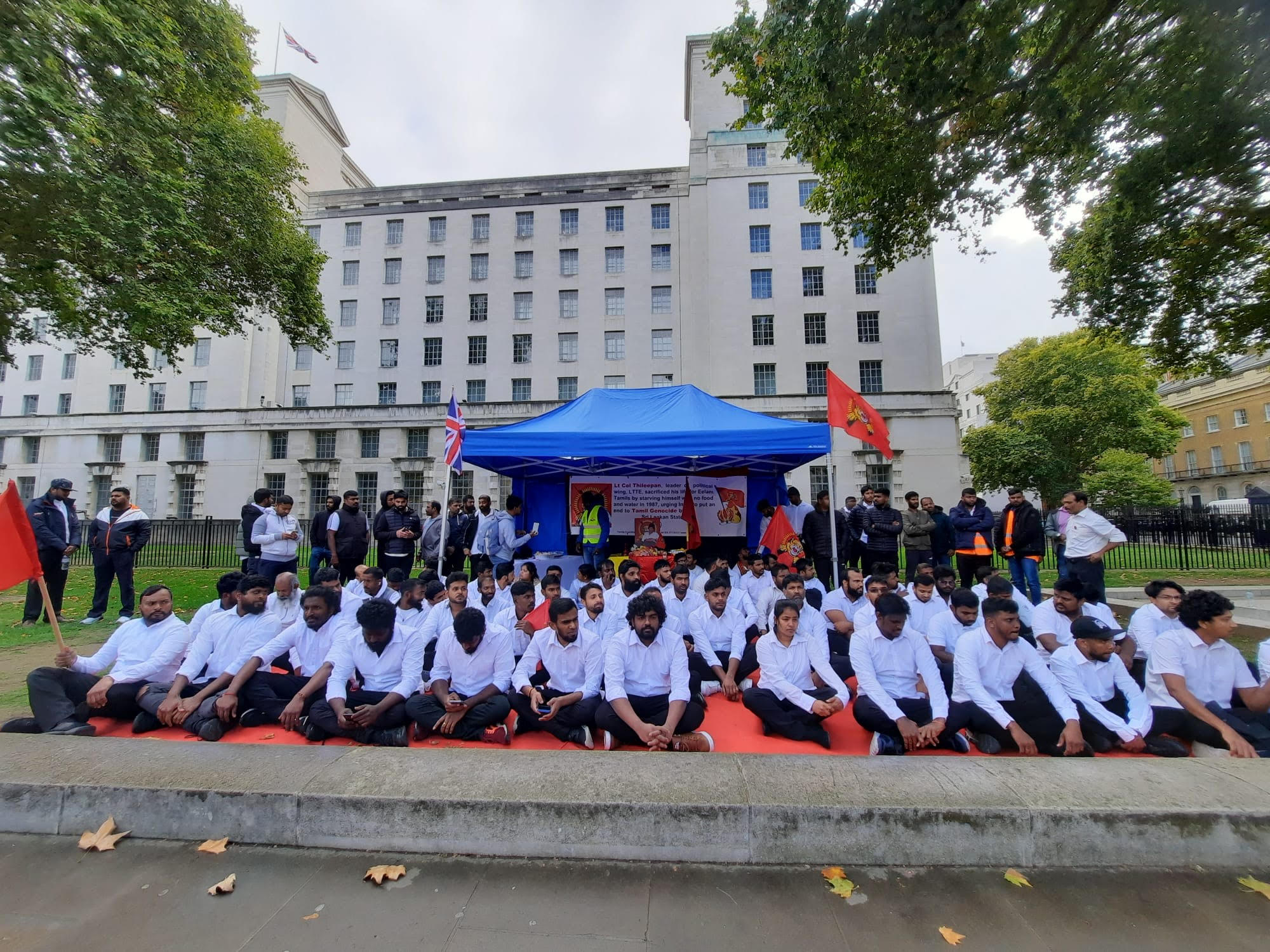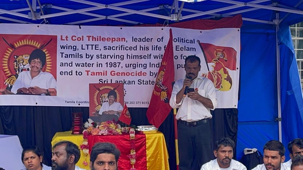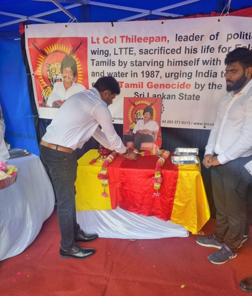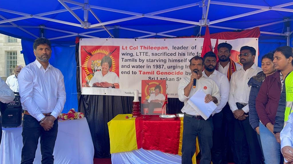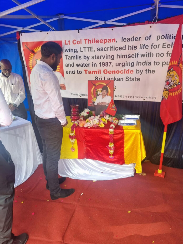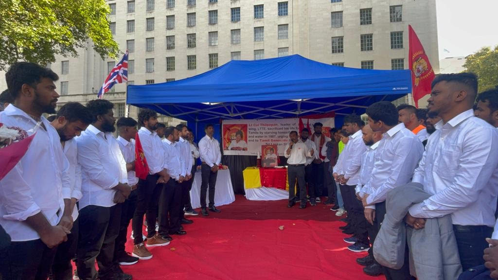 பிரித்தானிய பிரதமர் வதிவிடத்திற்க்கு முன்பாக தமிழர் ஒருங்கிணைப்புக் குழு பிரித்தானியக் கிளையின் ஒழுங்கமைப்பில் தமிழ்த் தேசிய செயற்பாட்டாளர்கள் இணைந்து திலீபனவர்களுக்கான நினைவேந்தல் அகம் அமைக்கப்பட்டு வெள்ளை கறுப்பு சீருடைஅணிந்த மனித நேயப் பணியாளர்களின் அடையாள உணவு தவிர்ப்புப் போராட்டம் நடை பெற்று வருகின்றது. தியாக தீபம் திலீபன் அவர்களுக்கான ஈகைச் சுடர் ஏற்றி வைக்கப்பட்டு அக வணக்கத்துடன் மலர் வணக்கம் செலுத்தப்பட்டு வருகின்றது. இன் நிகழ்வு பி.ப 5 மணி வரை நடை பெற இருக்கின்றது.நினைவு வணக்க உரைகள்.பி.ப4 மணிக்கு ஆரம்பமாகி உறுதி ஏற்புடன் நிறைவடைய இருக்கின்றது.