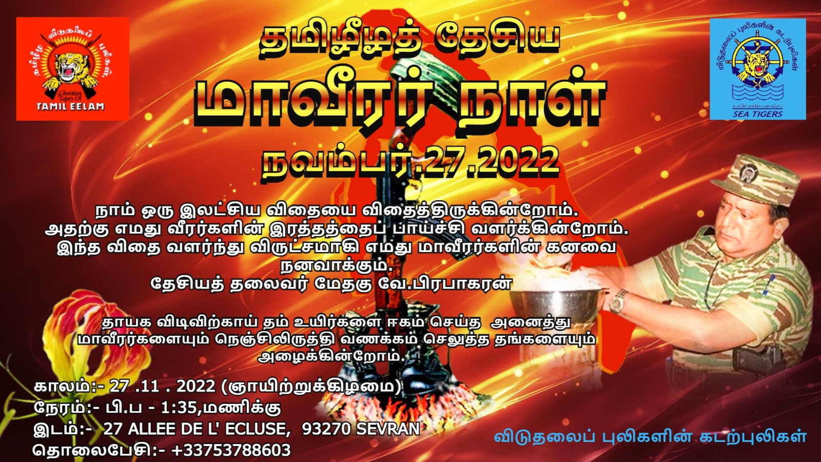 சிறப்பு செய்திகள்புலத்துச்செய்திகள் பிரான்சில் கடற்புலி மாவீரர்களுக்கான நினைவேந்தல்! By Admin - November 21, 2022 0 373 பிரான்சில் கடற்புலி மாவீரர்களுக்கான நினைவேந்தல்கள் வரும் 27.11.2022 ஞாயிற்றுக்கிழமை 01.35 மணிக்கு செவ்றோன் பகுதியில் இடம்பெற ஏற்பாடாகியுள்ளது.