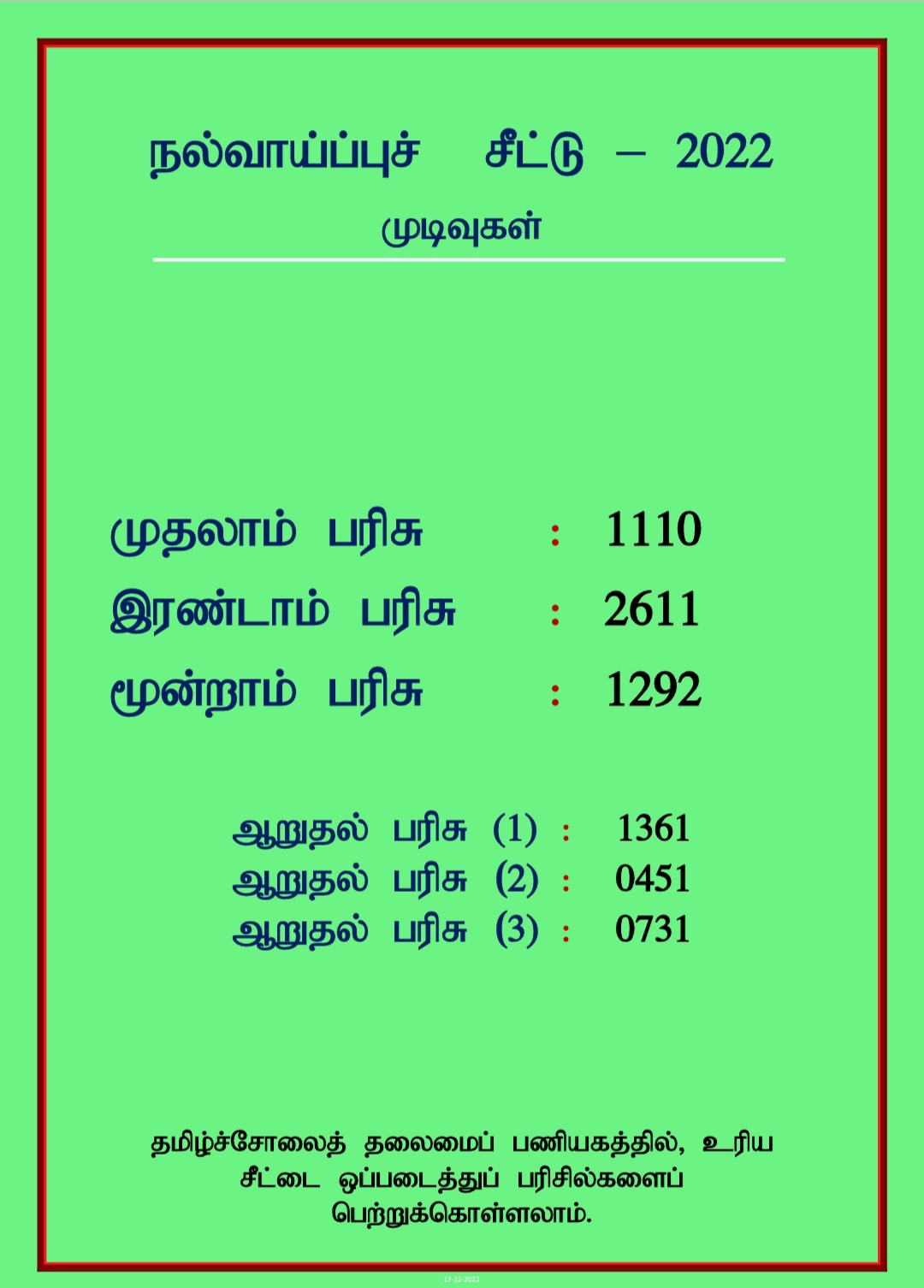 கலை நிகழ்வுகளின் இடையே தமிழ்ச்சோலைத் தலைமைப் பணியகத்தால் நடாத்தப்பட்ட பிரான்சு தழுவிய திருக்குறள் திறன் போட்டி-2022 இல் இறுதிப் போட்டியில் வெற்றியீட்டிய மாணவர்களுக்கான கேடயங்களும் சான்றிதழ்களும் வழங்கப்பட்டதுடன் இறுதிப்போட்டியில் பங்குபற்றிய மாணவர்களுக்கான பதக்கங்களும் சான்றிதழ்களும் வழங்கப்பட்டன.