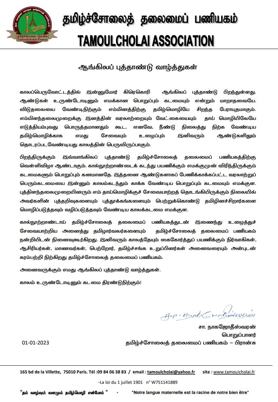 காலப்பெருவோட்டத்தில் இன்னுமோர் கிரெகொரி ஆங்கிலப் புத்தாண்டு பிறந்துள்ளது. ஆண்டுகள் உருண்டோடினும் எமக்கான பொறுப்பும் கடமையும் என்றும் மாறாதவையே. விடுதலையை வேண்டிநிற்கும் எம்மினத்திற்கு தமிழ்மொழியே சிறந்த பேராயுதமாகும். எம்மிளந்தலைமுறைக்கு இனத்தின் வரலாற்றையும் வேட்கையையும் தாய் மொழியிலேயே எடுத்தியம்புவது பொருத்தமானதும் கூட. எனவே, நீண்டு நிலைத்து நிற்க வேண்டிய தமிழ்மொழிக்காக எமது சேவையும் உழைப்பும் இனிவரும் ஆண்டுகளிலும் தொடரப்படவேண்டியது காலத்தின் பெருவிருப்பாகும்.