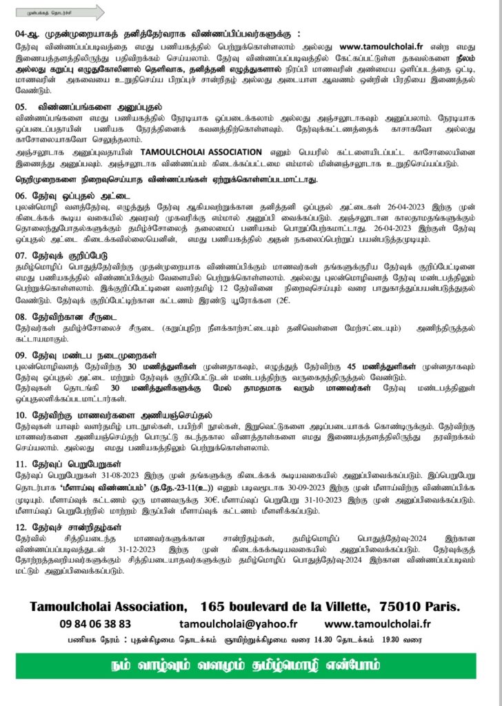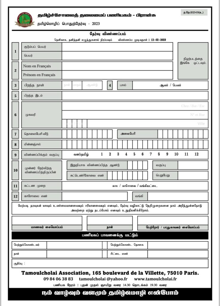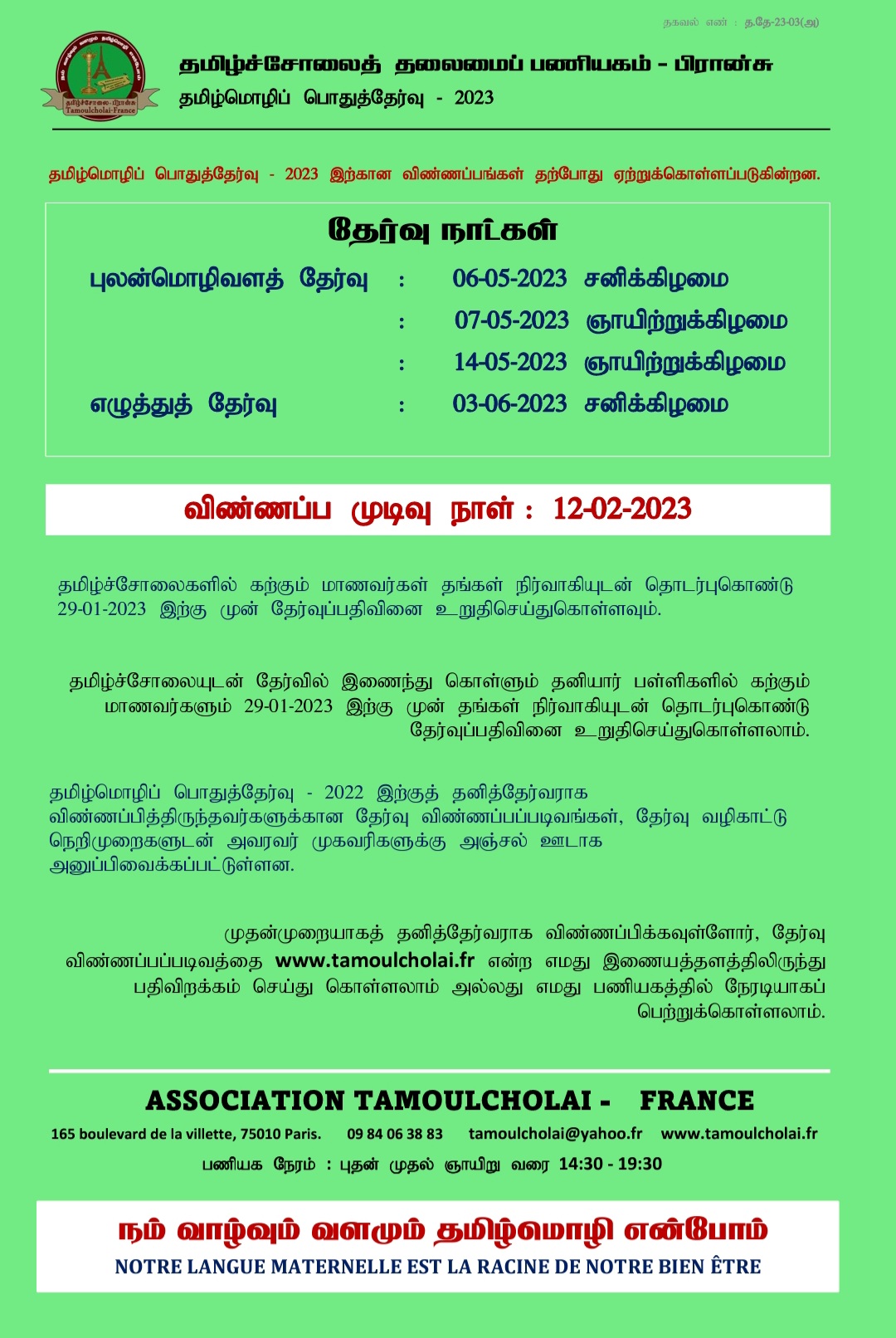 சிறப்பு செய்திகள்புலத்துச்செய்திகள் பிரான்சில் தமிழ்மொழிப் பொதுத் தேர்வு 2023 இற்கு தற்போது விண்ணப்பிக்கலாம்! By Admin - January 12, 2023 0 510 பிரான்சில் தமிழ்மொழிப் பொதுத் தேர்வு 2023 இற்கான விண்ணப்பங்கள் தற்போது ஏற்றுக் கொள்ளப்படுவதாகத் தமிழ்ச்சோலைத் தலைமைப் பணியகம் அறிவித்துள்ளது. மேலதிக தகவல்கள் கீழே இணைக்கப்பட்டுள்ளன. விண்ணப்ப முடிவுநாள் 12-02-2023.