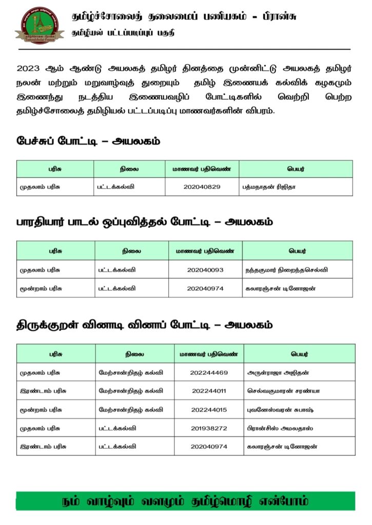 சிறப்பு செய்திகள்புலத்துச்செய்திகள் அயலகத் தமிழர் தின இணையவழிப் போட்டியில் வென்ற தமிழ்ச்சோலைத் தமிழியல் பட்டப்படிப்பு மாணவர்கள்! By Admin - January 12, 2023 0 240 2023 ஆம் ஆண்டு அயலகத் தமிழர் தினத்தை முன்னிட்டு அயலகத் தமிழர் நலன் மற்றும் மறுவாழ்வுத் துறையும் தமிழ் இணையக் கல்விக் கழகமும் இணைந்து நடத்திய இணையவழிப் போட்டிகளில் வெற்றி பெற்ற தமிழ்ச்சோலைத் தமிழியல் பட்டப்படிப்பு மாணவர்களின் விபரம்.
