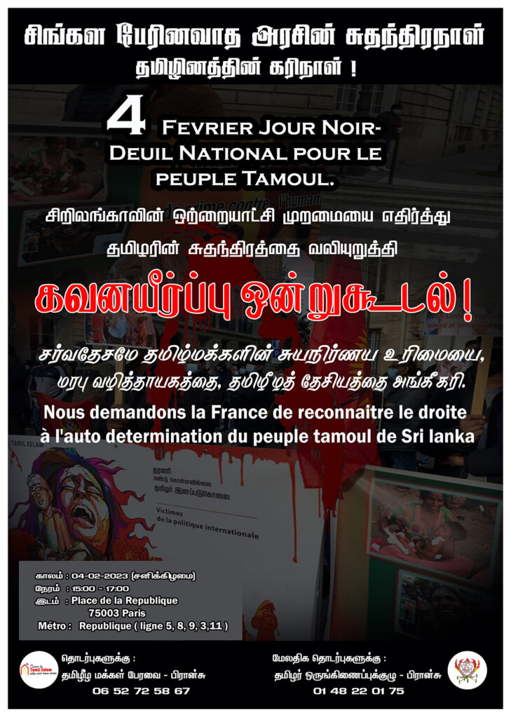 சிறப்பு செய்திகள்புலத்துச்செய்திகள் பிரான்சில் சிறிலங்கா அரசின் சுதந்திர நாள் தமிழினத்தின் கரிநாள் நாளை! By Admin - February 3, 2023 0 266 பிரான்சில் சிறிலங்கா அரசின் சுதந்திர நாள் தமிழினத்தின் கரிநாள் நிகழ்வு நாளை 04.02.2023 சனிக்கிழமை 15.00 மணி தொடக்கம் 17.00 மணிவரை Place de La Republique பகுதியில் இடம்பெறவுள்ளது.