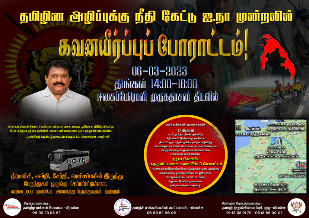 ஜெனிவாவில் நாளை மறுதினம் 06.03.2023 திங்கட்கிழமை இடம்பெறும் ஐ.நா.பேரணி நோக்கி பிரான்சு தலைநகரில் நான்கு இடங்களில் இருந்து (லாச்சப்பல், திரான்சி, சேர்ஜி, எவ்றி) பேருந்து ஏற்பாடுகள் செய்யப்பட்டுள்ளன. பேருந்துகள் காலை 6.00 மணிக்கு புறப்படவுள்ளன. இதில் நீங்களும் கலந்துகொள்ள விரும்பினால் விரைந்து உங்கள் வரவினை உறுதிப்படுத்துமாறு கேட்கப்பட்டுள்ளது.