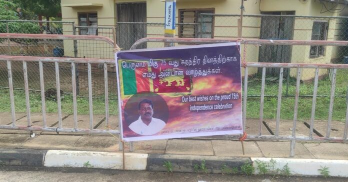 ஸ்ரீலங்காவின் சுதந்திரதினம் கரிநாளாக தமிழர்கள் அனுஸ்டிக்கப்பட்டு கொண்டிருக்கும் இன்றைய நாளில் முல்லைத்தீவு நகரில் 75 ஆவது இலங்கையின் சுதந்திர தினத்திற்கு வாழ்த்துத் தெரிவித்து முன்னாள் வடமாகாணசபை உறுப்பினர் து.ரவிகரன் அவர்களின் படம் பொறிக்கப்பட்ட பதாகைகள் இரண்டு இடங்களில் கட்டப்பட்டுள்ளன.