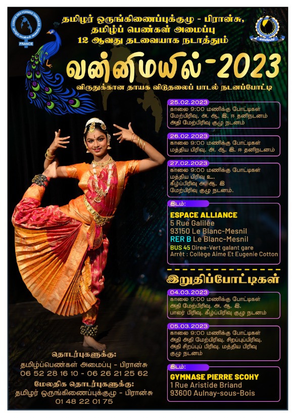 பிரான்ஸ் தமிழர் ஒருங்கிணைப்புக் குழு, தமிழ்ப்பெண்கள் அமைப்பு. 12ஆவது தடவையாக நடாத்தும் வன்னிமயில் 2023. தேச விடுதலைப் பாடலுக்கான நடனப்போட்டி ஐந்து தினங்கள் நடைபெறவுள்ளது.