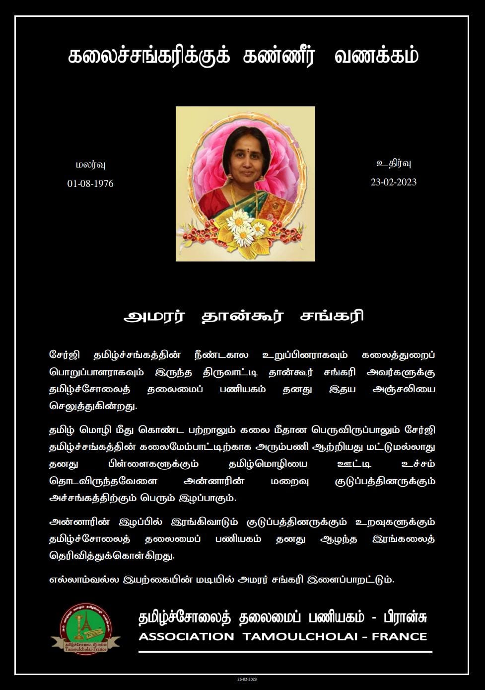 சேர்ஜி தமிழ்ச்சங்கத்தின் நீண்டகால உறுப்பினராகவும் கலைத்துறைப் பொறுப்பாளராகவும் இருந்த திருவாட்டி தான்கூர் சங்கரி அவர்களுக்கு தமிழ்ச்சோலைத் தலைமைப் பணியகம் தனது இதய அஞ்சலியை செலுத்துகின்றது.