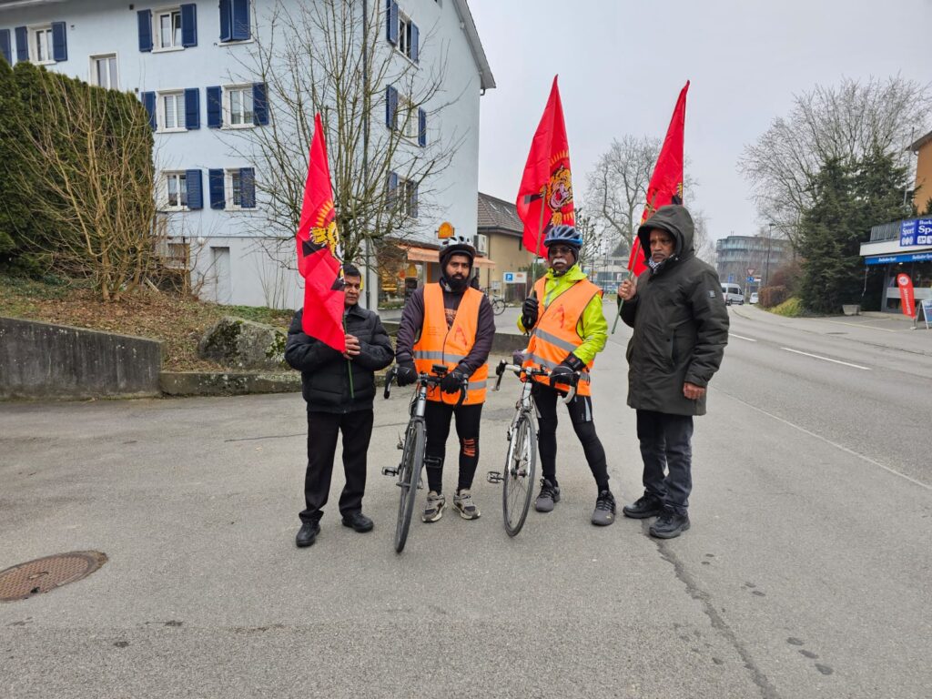 ஐக்கிய நாடுகளின் மனித உரிமைகள் ஆணையகத்தின் 52 வது கூட்டத்தொடர் நடைபெற்றுவரும் சூழலில் சிறிலங்கா பேரினவாத அரசினால் திட்டமிட்டு நடாத்தப்பட்டுவருகின்ற தமிழின அழிப்பிற்கு அனைத்துலக சுயாதீன விசாரணையை நடாத்தக் கோரியும் தமிழீழமே தமிழர்களுக்கான நிரந்தரத் தீர்வு என்பதனை வலியுறுத்தியும் கடந்த (17.02.2023 ) காலை 10 மணியளவில் பிரித்தானிய இல்லத்துக்கு முன்பாக ஆரம்பிக்கப்பட்ட ஈருருளிப்பயணம் கடந்த 1ம் திகதி மாலை சுவிஸ் நாட்டை வந்தடைந்தது.