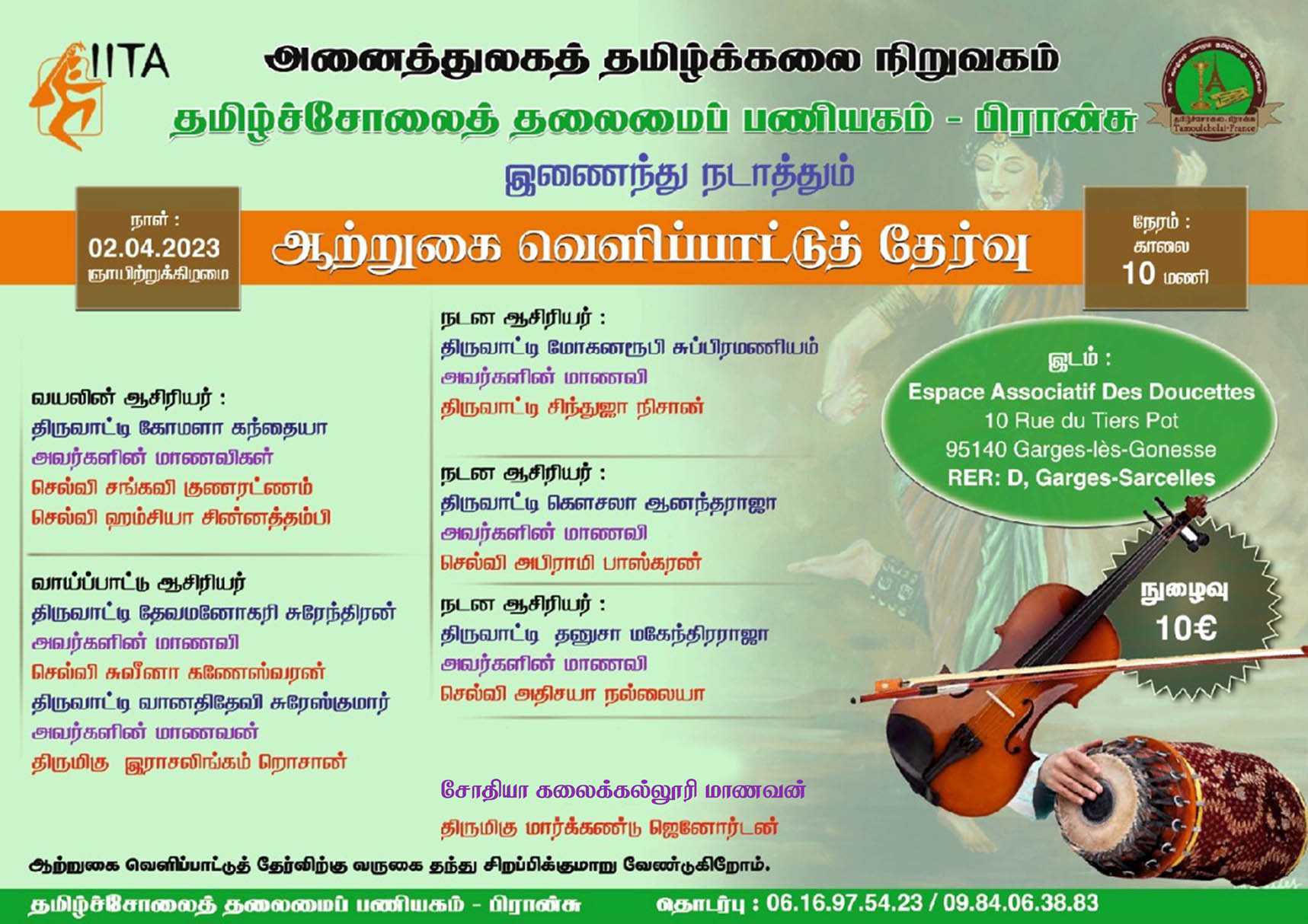 அனைத்துலகத் தமிழ்க்கலை நிறுவகம் தமிழ்ச்சோலைத் தலைமைப் பணியகம் – பிரான்சு இணைந்து நடாத்தும் ஆற்றுகை வெளிப்பாட்டுத் தேர்வு 2023 வரும் 02.04.2023 ஞாயிற்றுக்கிழமை பிரான்சின் புறநகர் பகுதியான கார்லே கோணேஸ் என்னும் இடத்தில் காலை 10.30 மணிக்கு இடம்பெறவுள்ளது.