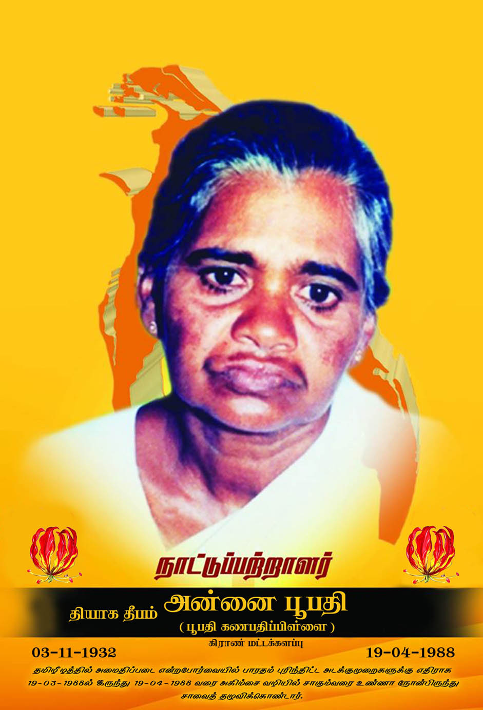 இந்தியப் படைகளால் தமிழர் தாயகத்தில் வலிந்து திணிக்கப்பட்ட போரையும் அடாவடிகளையும் நிறுத்த வலியுறுத்தி மட்டக்களப்பு மண்ணில் உண்ணாவிரத அறப்போர் புரிந்து காந்தி தேசத்திற்கே அகிம்சையைப் போதித்து தன்னுயிர் நீத்த அன்னை பூபதியின், உண்ணாவிரத அறப்போராட்டத்தின்இறுதி வார நினைவேந்தல் நேற்று முன்தினம் (17.04.2023) ஞாயிற்றுக்கிழமை , பல்கலை மாணவர்களால் உணர்வுபூர்வமாக நினைவேந்தப்பட்டது.