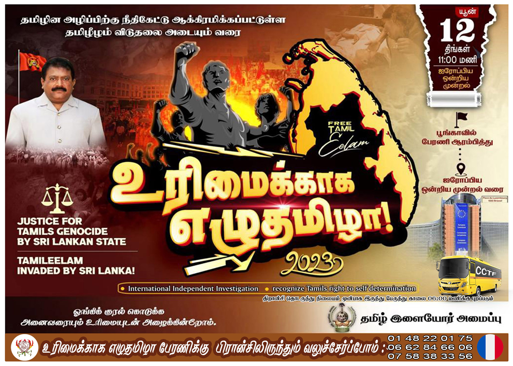 12.06.2023 திங்கள் ஐரோப்பிய ஒன்றியத்திற்கு முன்னால் தமிழின அழிப்பிற்கு நீதி கேட்டு, ஆக்கிரமிக்கப்பட்டுள்ள தமிழீழம் விடுதலையடையும் வரை ”உரிமைக்காக எழுதமிழா”ஒன்றுகூடலுக்கு பிரான்சிலிருந்தும் வலுச்சேர்ப்போம்.