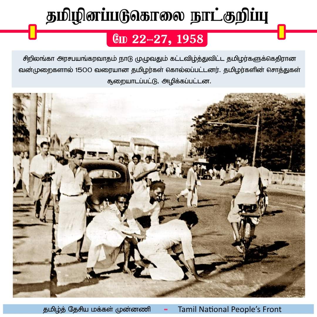 1958ஆம் ஆண்டு தமிழ இனப் படுகொலை என்பது திடீரென ஏற்பட்ட ஒன்றல்ல. இதற்குப் பலமான பின்புலம் ஒன்று இருக்கிறது. 1956ஆம் ஆண்டு கொண்டுவரப்பட்ட முப்பத்துமூன்றாம் இலக்கச் சிங்களம் மட்டும் சட்டம் ஏற்படுத்திய தாக்கத்தின் விளைவாகத் தமிழர் தரப்பினர் 1956ஆம் ஆண்டு யூன் மாதம் ஐந்தாம் திகதி கொழும்பு காலி முகத்திடலில் சிங்களம் மட்டும் சடடத்திற்கு எதிராகச் சத்தியாக்கிரகப் போராட்டத்தை நடத்தினார்கள். இந்தப் போராட்டம் சிங்களக் காடையர்களால் வன்முறை பிரயோகிக்கப்பட்டு ஒடுக்கப்பட்டது.