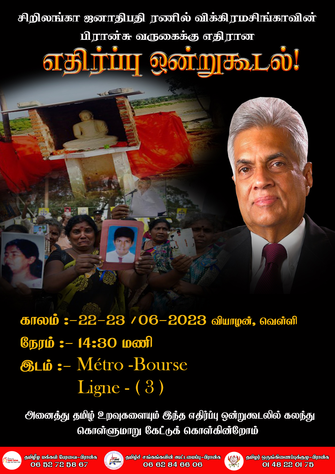காலம்: 22.06.2023 வியாழக்கிழமை, மற்றும் 23.06.2023 வெள்ளிக்கிழமை Métro -Bourse ( Ligne(3) முன்பாக பி. பகல் 14:30 மணிக்கு