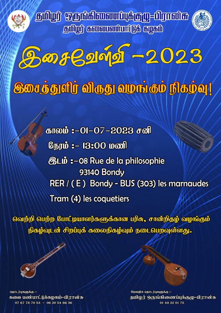 பிரான்சு தமிழர் ஒருங்கிணைப்புக்குழு தமிழர் கலைபண்பாட்டுக்கழகத்தால் 9 ஆவது ஆண்டாக நடாத்தப்படும் இசைவேள்வி கர்நாடக சங்கீத இசைத்திறன் போட்டிகள் கடந்த 17.06.2023 சனிக்கிழமை 18..06..2023 ஞாயிற்றுக்கிழமை பொண்டிப் பகுதியில் மிகச் சிறப்பாக இடம்பெற்று முடிந்த நிலையில் போட்டியில் வெற்றிபெற்ற போட்டியாளர்களுக்கான பரிசில்கள், சான்றிதழ்கள் மற்றும் பங்குபற்றிய போட்டியாளர்களுக்கான விருது வழங்கும் நிகழ்வு பொண்டிப்பகுதியில் எதிர்வரும் (01.07.2023) சனிக்கிழமை பகல் 13.00 மணிக்கு இடம்பெறவுள்ளது.