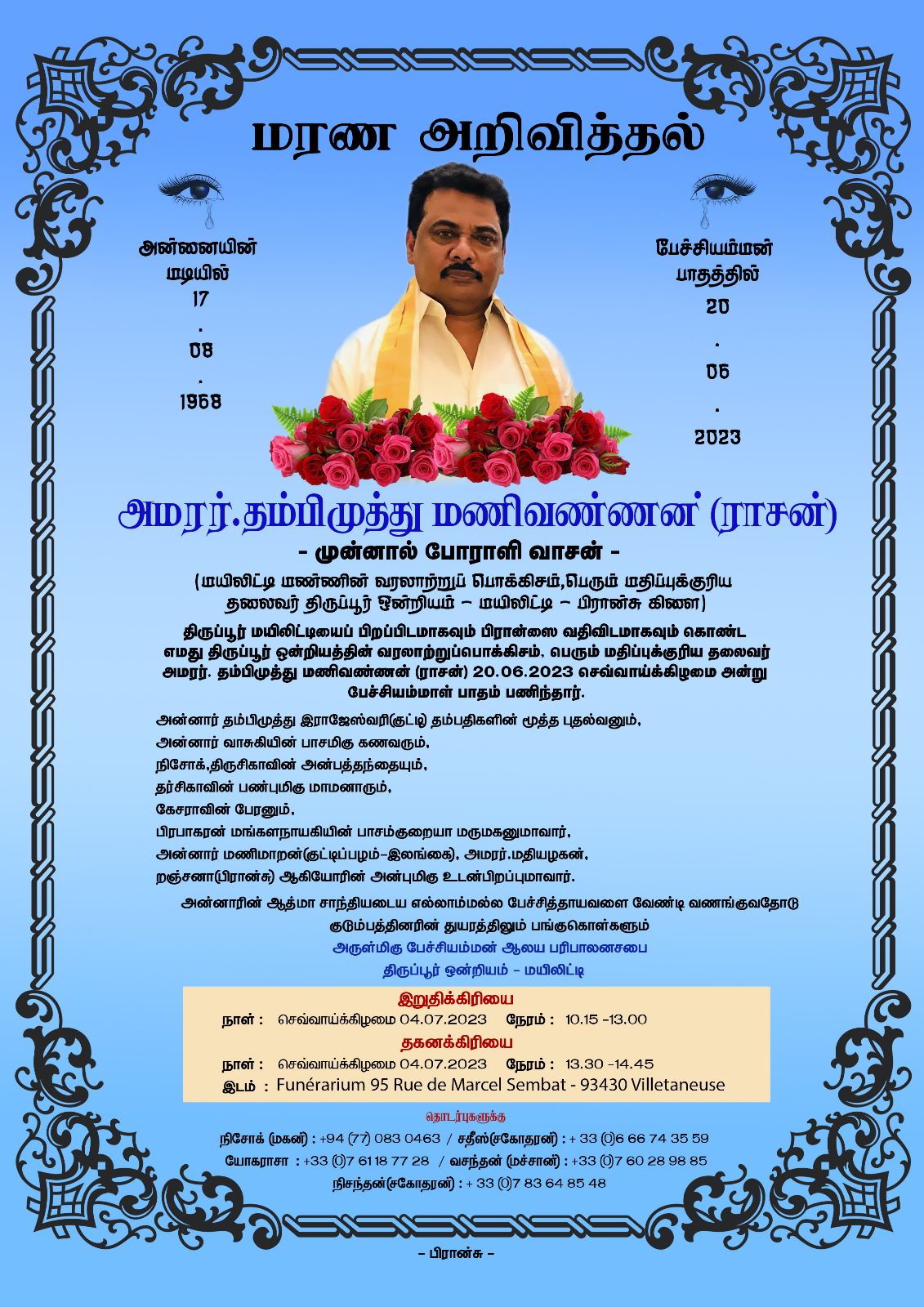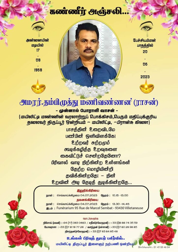 பிரான்சில் சாவடைந்த தமிழீழ விடுதலைப் புலிகளின் முன்னாள் போராளி அமரர்.தம்பிமுத்து மணிவண்ணன் (தீவுராசன் – வாசன்) அவர்களின் இறுதி நிகழ்வு எதிர்வரும் 04.07.2023 செவ்வாய்க்கிழமை Villetaneuse பகுதியில் இடம்பெறவுள்ளது