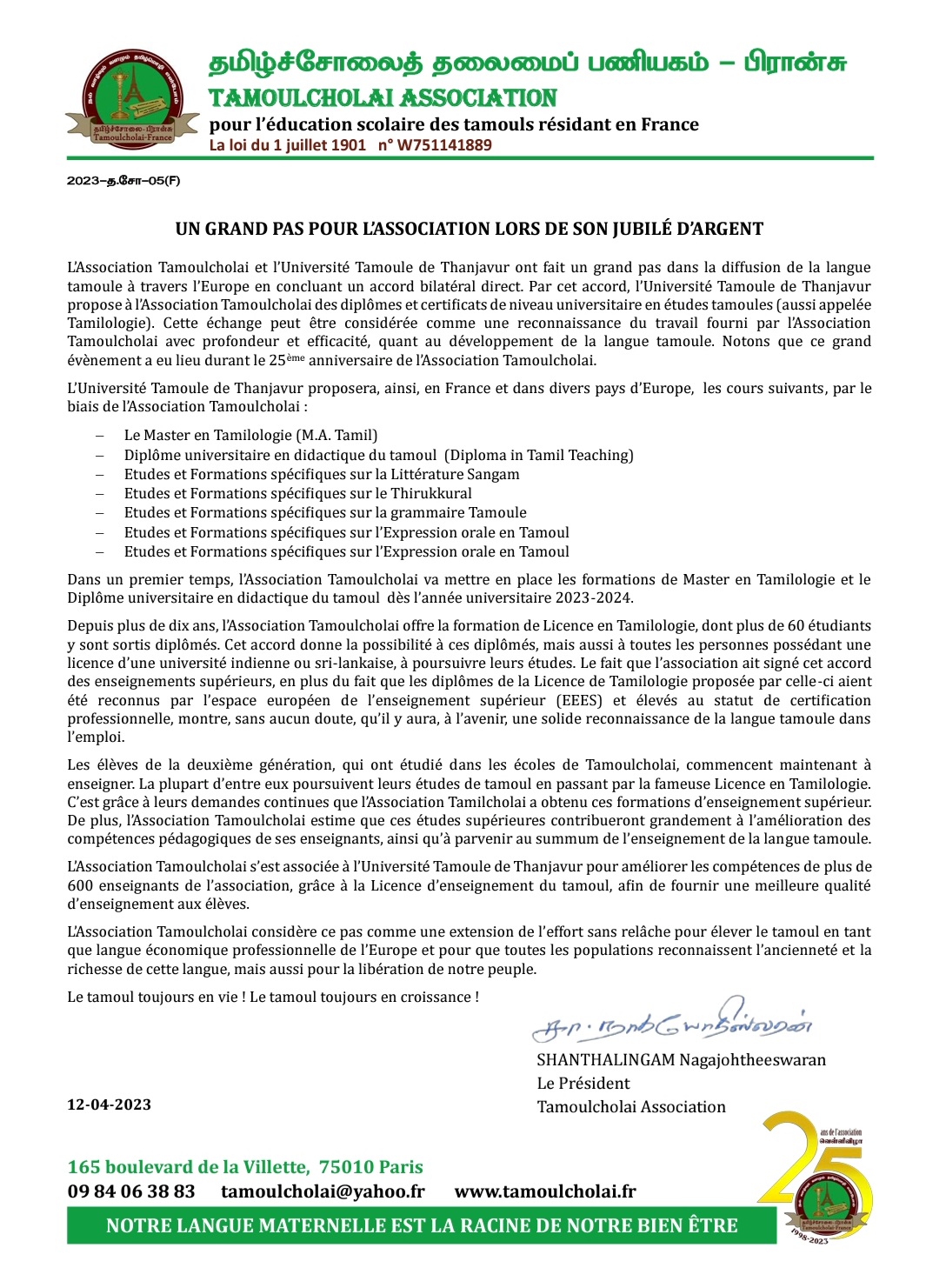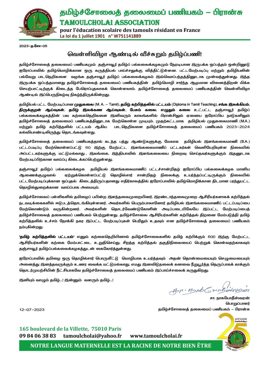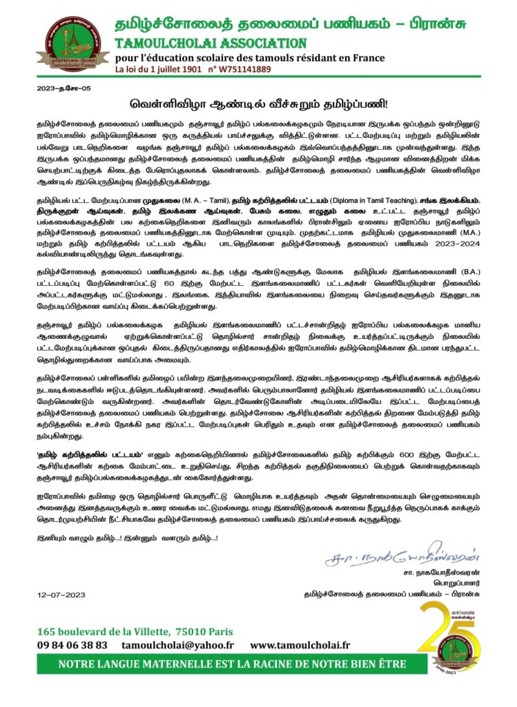 ‘தமிழ் கற்பித்தலில் பட்டயம்’ எனும் கற்கைநெறியினால் தமிழ்ச்சோலைகளில் தமிழ் கற்பிக்கும் 600 இற்கு மேற்பட்ட ஆசிரியர்களின் கற்கை மேம்பாட்டை உறுதிசெய்து, சிறந்த கற்பித்தல் தகுதிநிலையைப் பெற்றுக் கொள்வதற்காகவும் தஞ்சாவூர் தமிழ்ப்பல்கலைக்கழகத்துடன் கைகோர்த்துள்ளது.