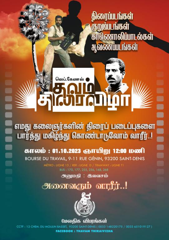 சிறப்பு செய்திகள் பிரான்சில் லெப்.கேணல் தவம் நினைவாக திரைவிழா 2023! By Admin - September 26, 2023 0 210 எமது கலைஞர்களின் படைப்புக்களை வளர்க்கவும், அவர்களை ஊக்கப்படுத்துவும் அவர்களின் படைப்புக்களைப்பார்த்து மகிழ்ந்து கொண்டாடுவோம் வாருங்கள்.
