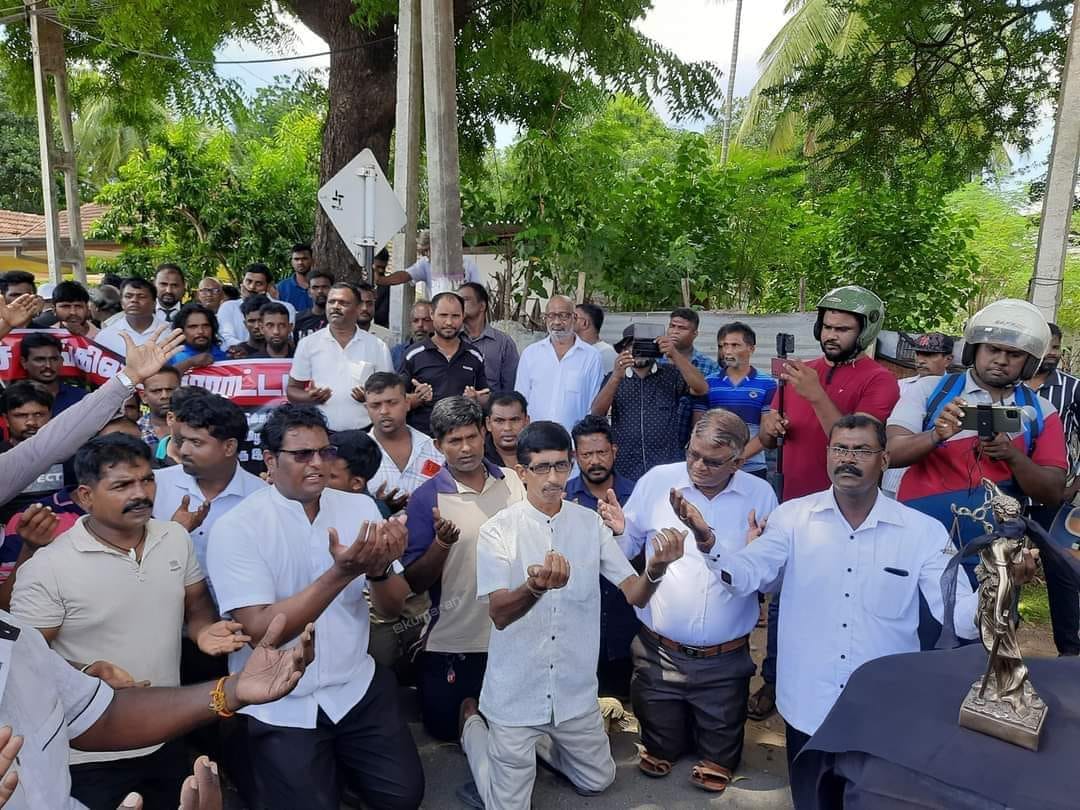 பின்னர் சட்டத்தரணிகள் ,அரசியல் வாதிகள் என போராட்டத்தில் கலந்து கொண்டோர் நீதி தேவதையின் உருவ சிலைக்கு முன் மண்டியிட்டு , நீதி கோரினர்.