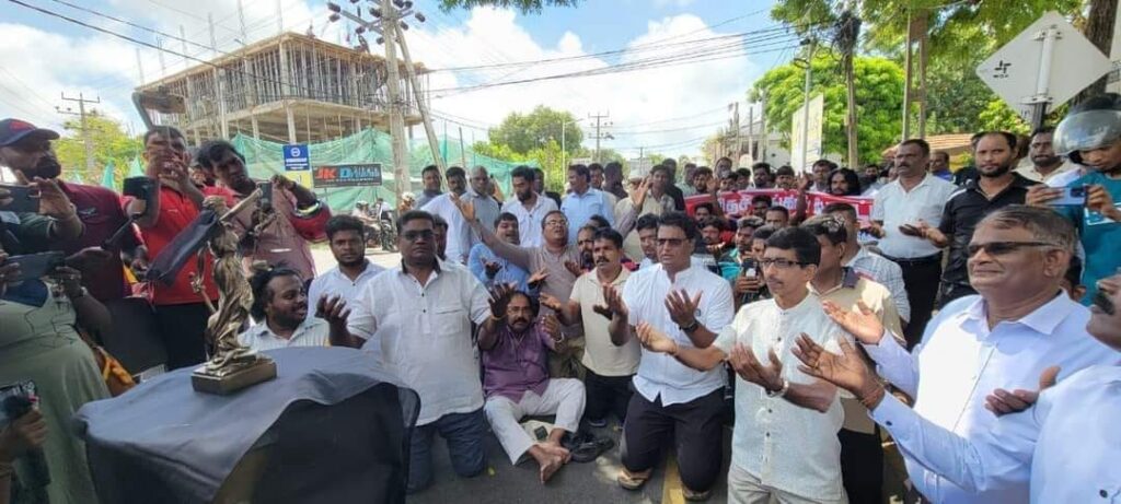 யாழ்ப்பாணத்தில் சட்டத்தரணிகள் நீதி தேவதையிடம் மண்டியிட்டு , நீதிபதிக்கு நீதி கோரினர்.
