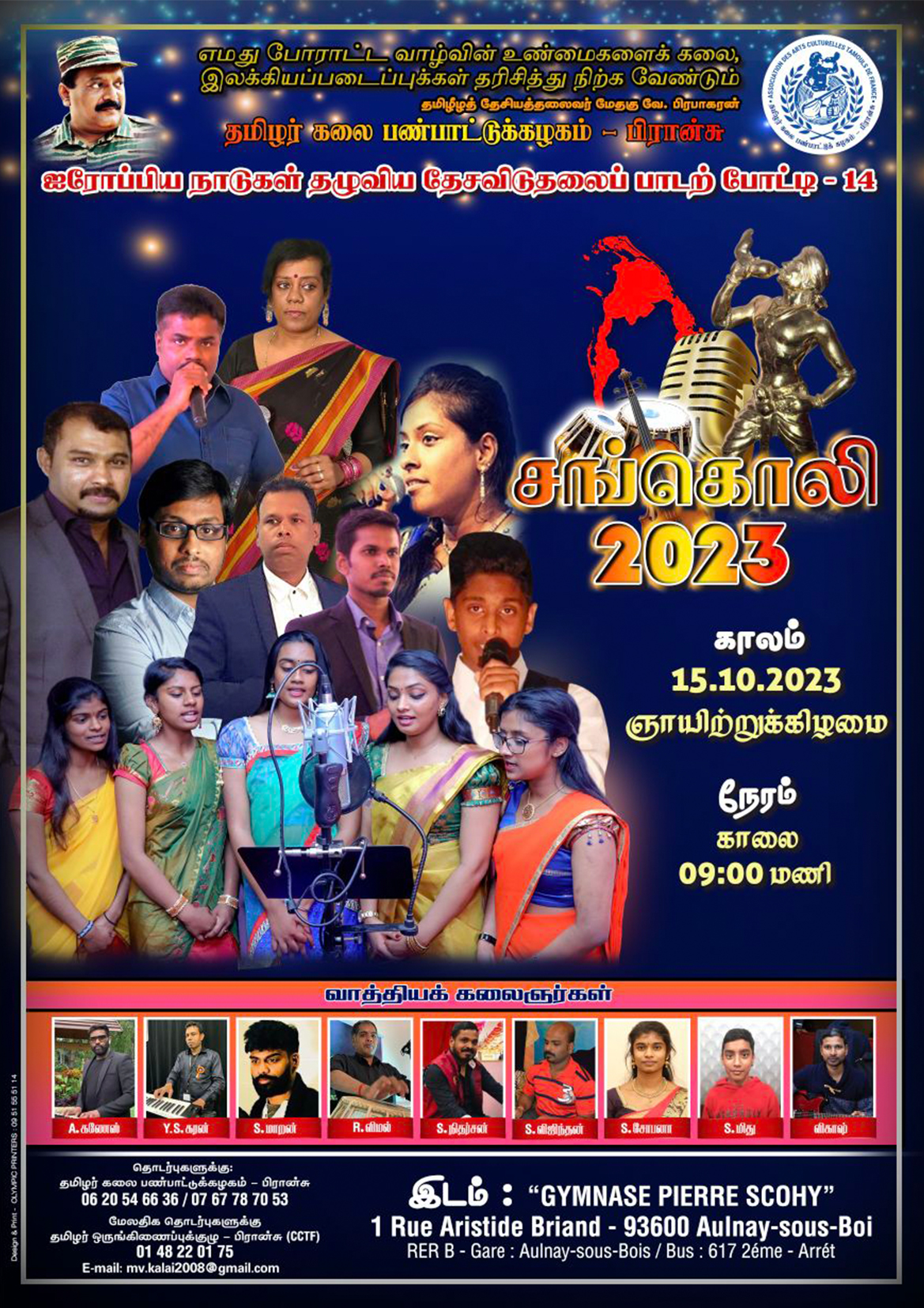 தமிழர் ஒருங்கிணைப்புக்குழு-பிரான்சு, தமிழர் கலைபண்பாட்டுக் கழகம் பிரான்சு 14 நான்காவது தடவையாக நடாத்தும், ஜரோப்பிய நாடுகள் தழுவிய தேசவிடுதலைப் பாடற்போட்டி சங்கொலி -14. எதிர் வரும் 15-10-2023 ஞாயிற்றுக்கழமை நடைபெறவுள்ளது.