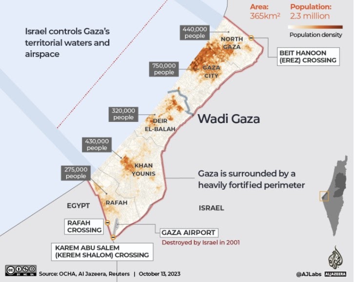 காஸாவில் 5 பகுதிகளில் சுமார் 2.3 மில்லியன் மக்கள் வசிக்கின்றனர். அவை வடக்கு காசா, காசா நகரம், டெய்ர் எல்-பாலா, கான் யூனிஸ் மற்றும் ரஃபா என்பவாகும்.