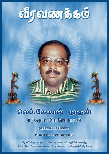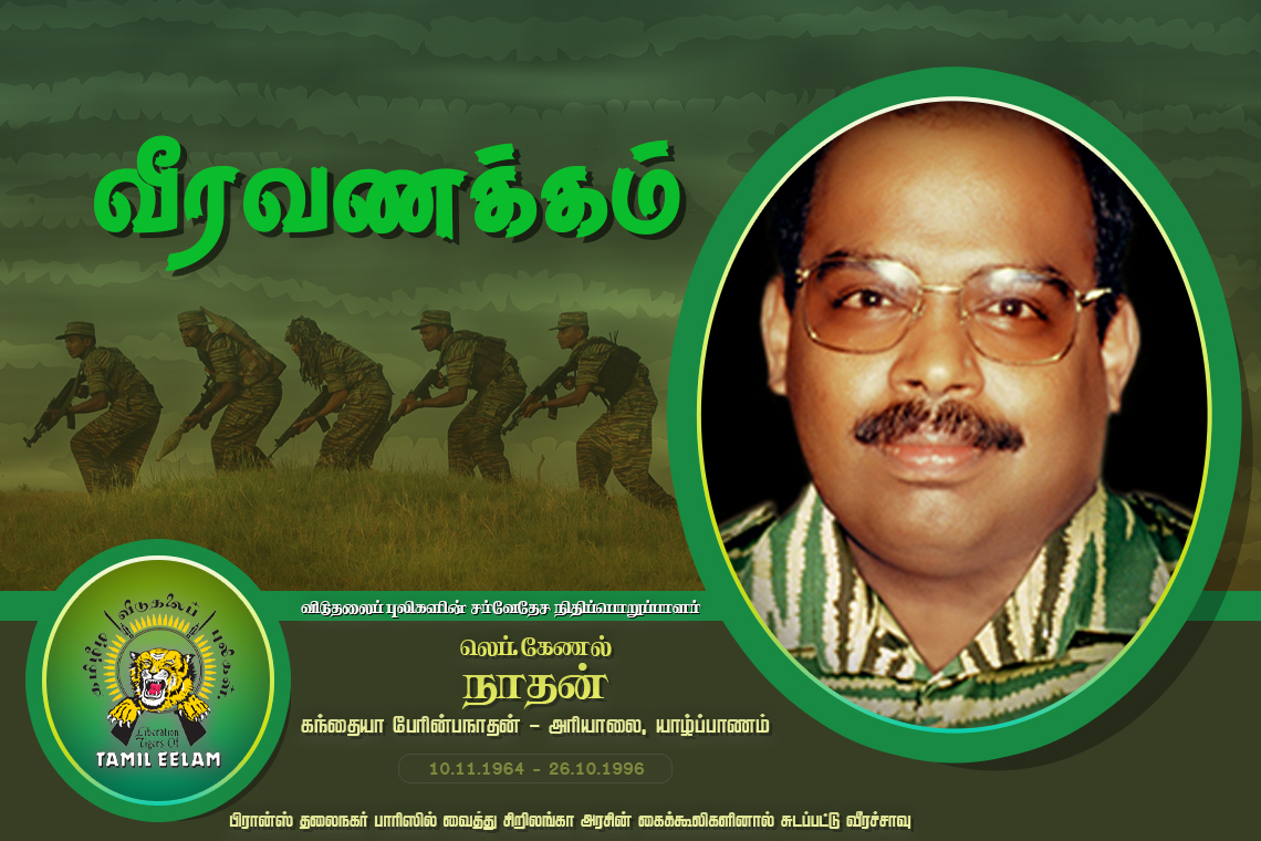 தமிழீழ விடுதலைப் புலிகள் இயக்கத்தின் சர்வதேச செயல்பாடுகளுக்கு தூணாக நின்ற ஒரு போராளி. புலம் பெயர் தமிழர் வாழும் பரப்பெங்கும் இயக்கத்தின் செயல்பாடுகளை பரப்பலாக்கி விடுதலைப் போரின் அடிப்படைத் தேவைகளுக்கு தோள் கொடுத்த மாவீரன். 12 ஆண்டுகள் இயக்கத்தின் கால்களாக நின்று ஓடி ஓடி உழைத்த மாவீரன் நாதன். யாழ்ப்பாணம் அரியாலையில் ஒரு நடுத்தர வர்க்க குடும்பத்தில் பிறந்தவன். தாயின் அரவணைப்பில் வாழ்ந்த நாதன் சிங்கள அரச பயங்கரவாத புயல் எம் தேசத்தை சூறையாடிய போது தாயாலும் சகோரராலும் பிரான்சுக்கு அனுப்பப்பட்டவன்.