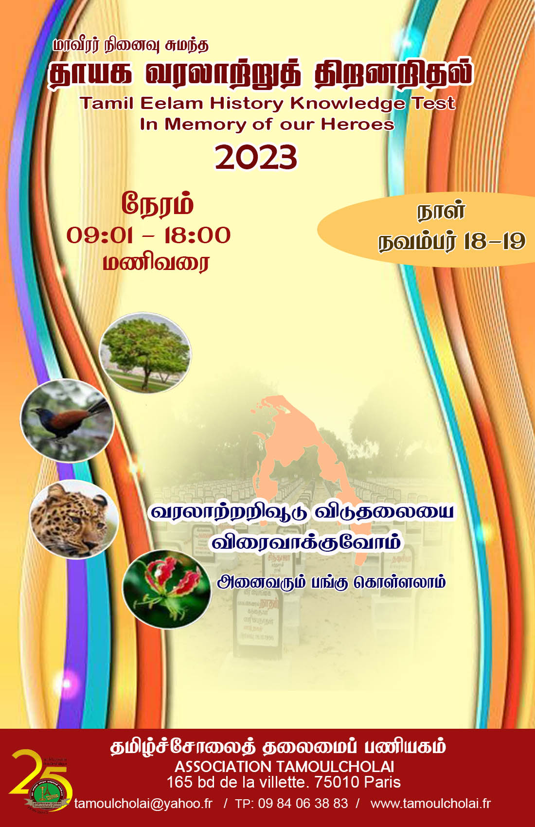 ‘மாவீரர் நினைவு சுமந்த தாயக வரலாற்றுத் திறனறிதல்’ நான்காவது ஆண்டாக “நவம்பர் 18 மற்றும் 19 ஆகிய நாட்களில் ஐரோப்பிய நேரம் காலை 9.01 மணிமுதல் மாலை 18.00 மணிவரை இணைய வழியில் நடாத்தப்படவுள்ளது எனத் தமிழ்ச்சோலைத் தலைமைப் பணியகம் அறிவித்துள்ளது.