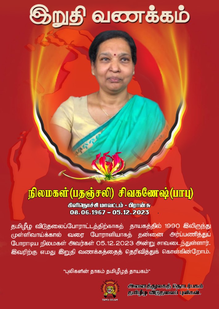 சிறப்பு செய்திகள் நிலமகள்( பதஞ்சலி) சிவகணேஸ் அவர்களுக்கு அனைத்துலகத் தொடர்பகம் தனது இறுதி வணக்கத்தை செலுத்தியுள்ளது! By Admin - December 12, 2023 0 197 நிலமகள்( பதஞ்சலி) சிவகணேஸ் அவர்கள் 05/12/2023 அன்று உடல் நலக்குறைவால் சாவடைந்தார். அவர்களுக்கு அனைத்துலகத் தொடர்பகம் தனது இறுதி வணக்கத்தை செலுத்தியுள்ளது.