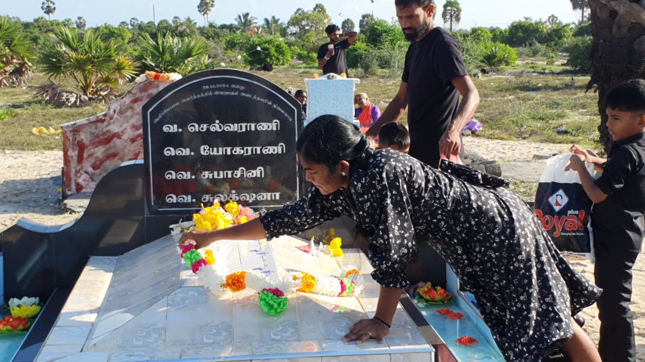 சுனாமியால் உயிரிழந்தவர்களுக்காக அமைக்கப்பட்ட தூபிக்கு மாலை அணிவிக்கப்பட்டு 9.25 மணிக்கு பொதுச்சுடர் ஏற்றப்பட்டது. தொடர்ந்து உயிரிழந்தவர்களின் புகைப்படங்களுக்கு மாலையிட்டு தீபங்கள் ஏற்றி உணவுகளை படைத்து உறவினர்கள் அஞ்சலித்தனர்.
