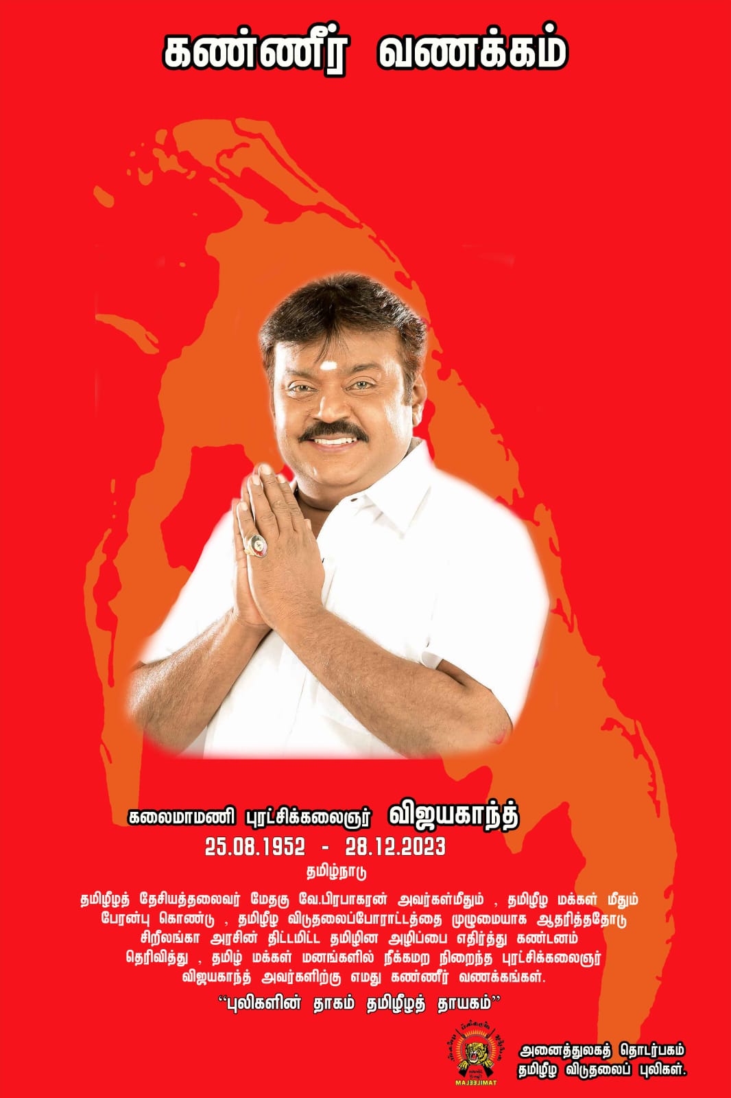 சிறப்பு செய்திகள் புரட்சிக் கலைஞர் கலைமாமணி விஜயகாந்த் அவர்களுக்கு கண்ணீர்வணக்கம் ! அனைத்துலக தொடர்பகம். By Admin - December 29, 2023 0 157