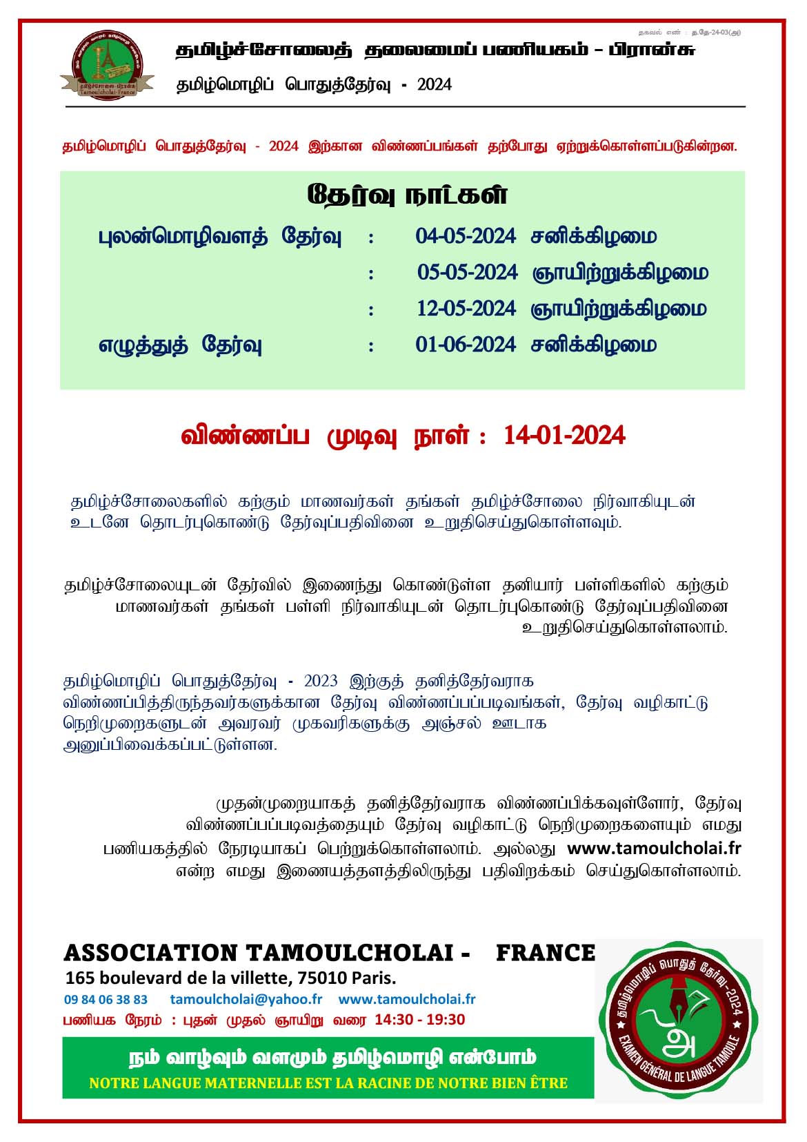 தமிழ்ச்சோலைத் தலைமைப் பணியகத்தால், தமிழ்மொழிப் பொதுத்தேர்வு-2024 இற்கான விண்ணப்பங்கள் தற்போது ஏற்றுக்கொள்ளப்பட்டுக் கொண்டிருக்கின்றன. விண்ணப்ப முடிவுநாள் 14-01-2023 ஆகும்.