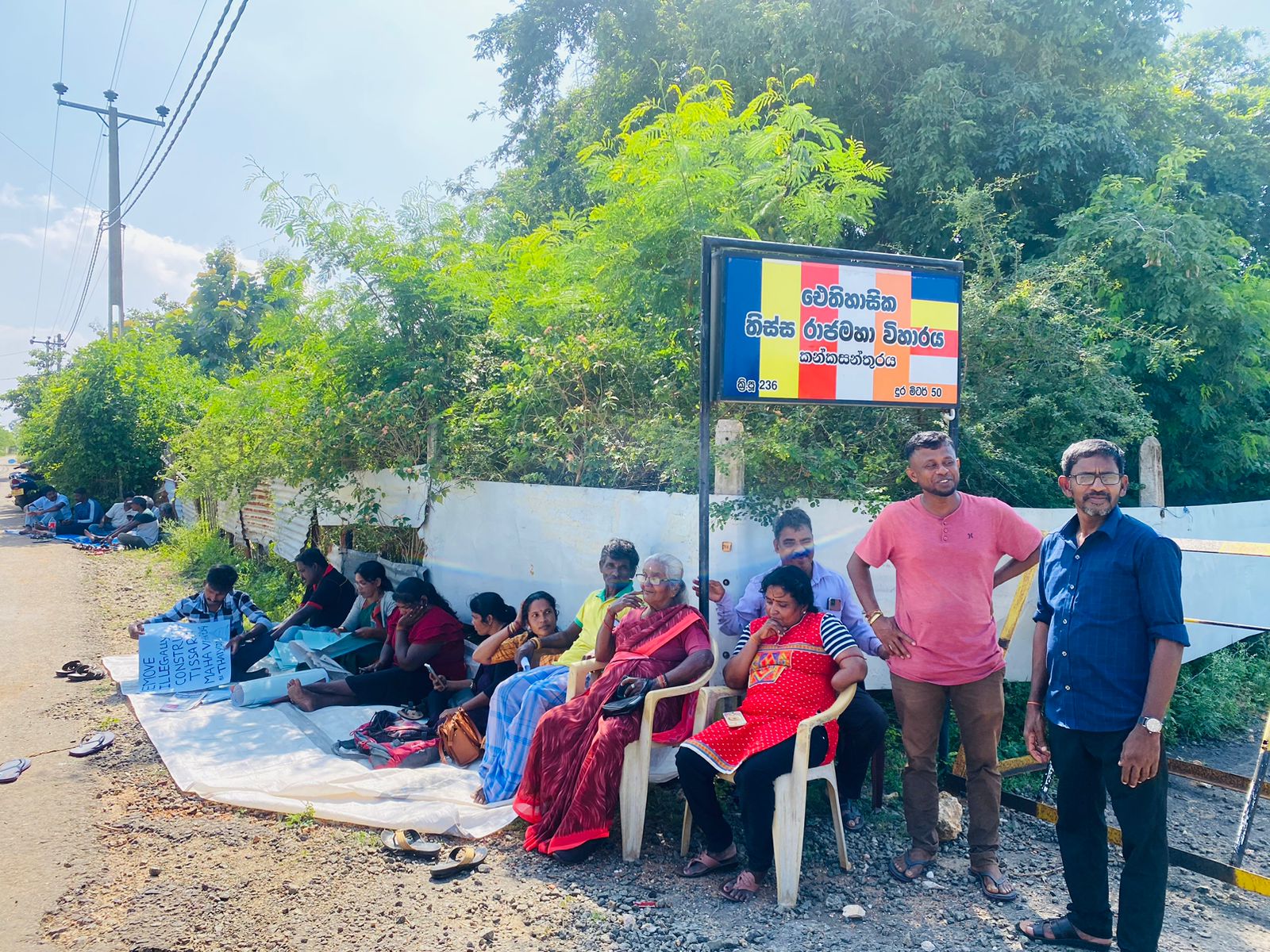 வடக்கும் கிழக்கும் தமிழர் தாயகம் ,தனியார் காணிகளை அபகரித்து கட்டிய விகாரையை உடனே அகற்று , சட்டவிரோதமாக அமைத்த விகாரையை உடனே அகற்று என்னும் கோசங்களுடன் பதாதைகளை ஏந்தியவாறு போராட்டம் இடம்பெறுகிறது.