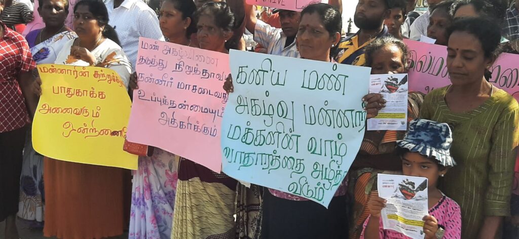இப்போராட்டத்தில் ஈடுபட்டவர்கள் ‘மனித உயிர்களை காவு கொள்ளுகின்ற மண் அகழ்வு, காற்றாலை நடவடிக்கைக்கு காணிகளை விற்காதே’, ‘மண் அகழ்வை நிறுத்தாவிடில் நன்னீர் மாசடைவதுடன் உப்புத் தன்மையும் அதிகரிக்கும்’, ‘மன்னாரின் சுற்றுச்சூழலை பாதுகாக்க அனைவரும் ஒன்றிணைவோம்’, ‘கனியவள மண் அகழ்வு மன்னார் மக்களின் வாழ்வாரத்தை அழித்துவிடும்’ போன்ற வாசகங்கள் குறிப்பிடப்பட்டிருந்த பதாதைகளை ஏந்தியவாறு கோஷங்கள் எழுப்பினர்.