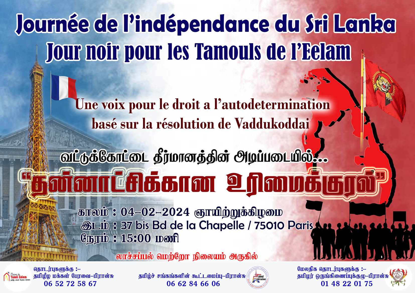 சிறிலங்காவின் சுதந்திரநாள், தமிழர்களிற்கு கரிநாள்!! என்ற தாயக தமிழ் மக்களின் உணர்வுடன், உலகத்தமிழ் மக்களால் ஓங்கியொலிக்க படவுள்ள குரலுடன் பிரான்சு வாழ்தமிழீழ மக்கள் நாமும் இணைந்து கொள்வோம்.