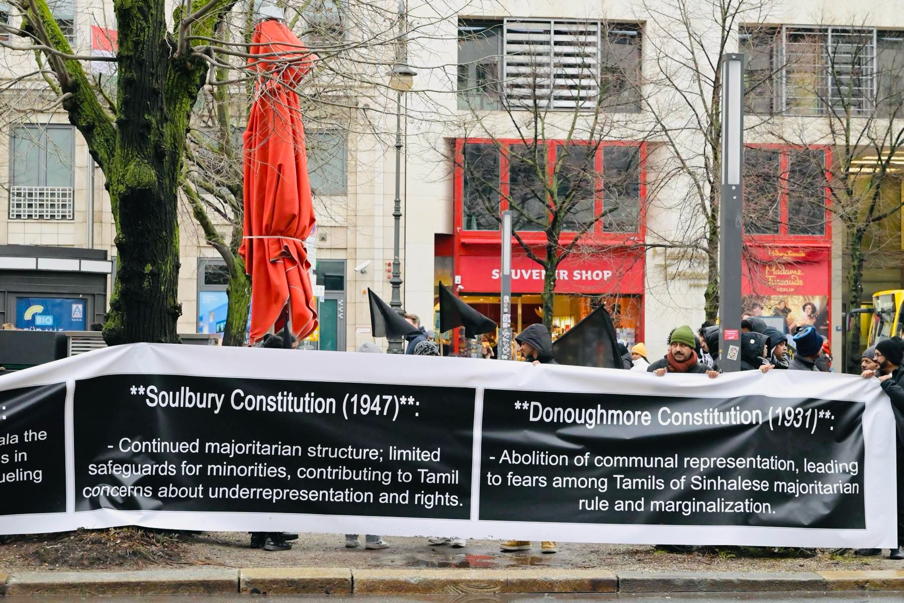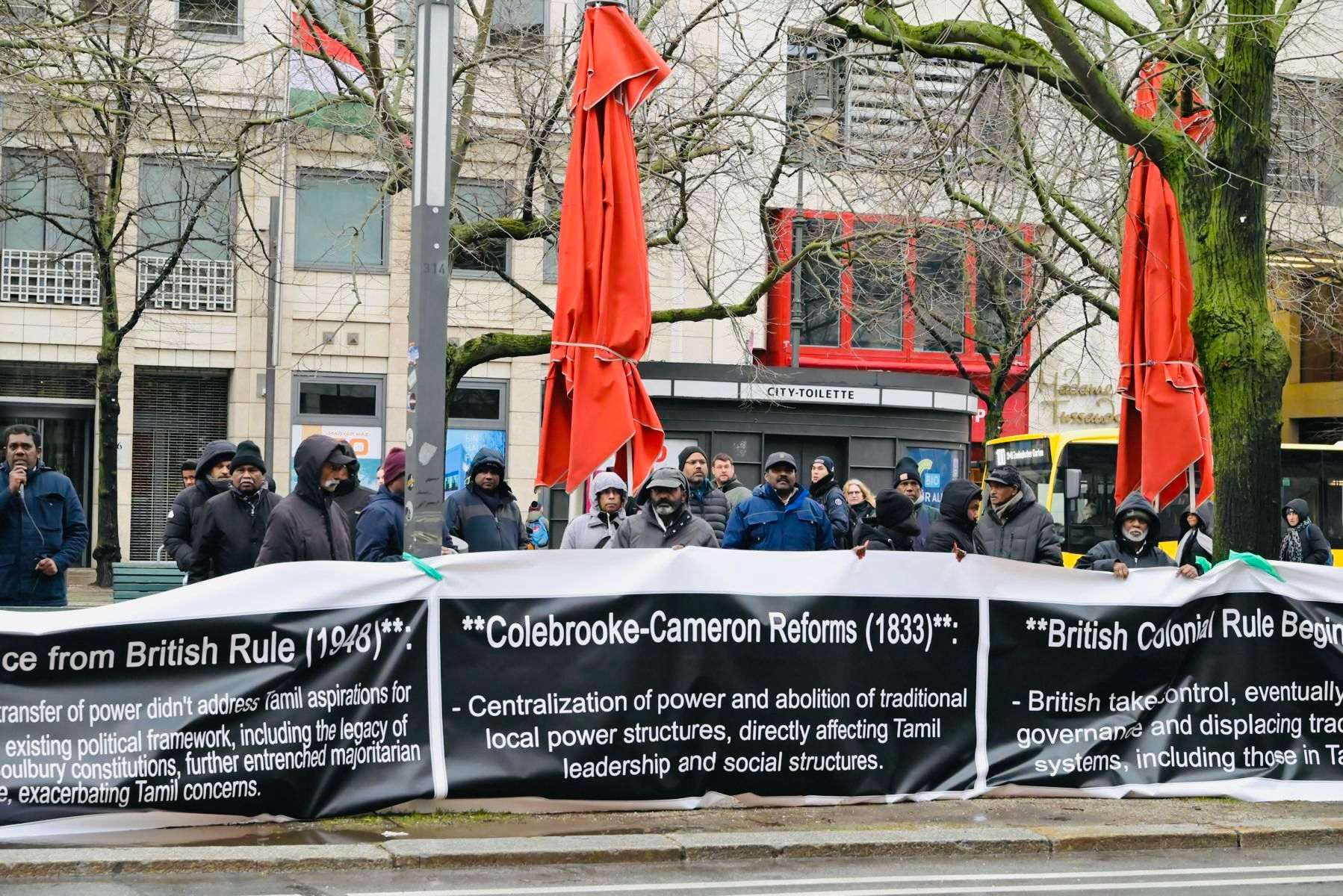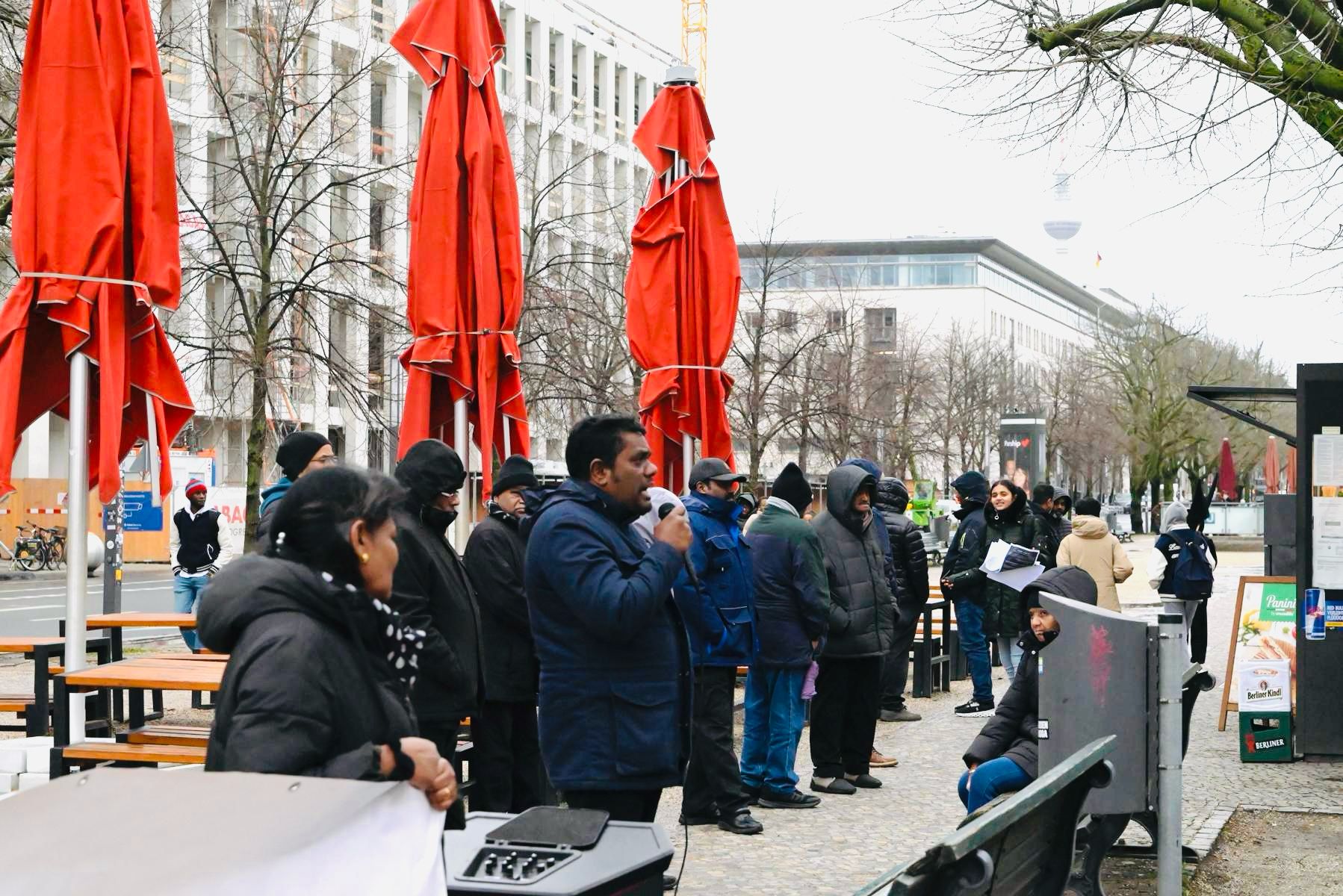 தமிழின அழிப்புக்கு பரிகார நீதியை வலியுறுத்தி சர்வதேச முற்சந்தியில் பாரிய பதாதைகளை ஏந்திய வண்ணம் துண்டுப்பிரசுரங்களை யேர்மன் மற்றும் ஆங்கில மொழிகளில் வேற்றின மக்களுக்கு விநியோகித்தனர். கடும் குளிரையும் பாராமல் இப்போராட்டத்தில் தமிழின உணர்வாளர்கள் பல்வேறு நகரங்களிலும் இருந்தும் கலந்துகொண்டது குறிப்பிடத்தக்கது.தாயகத்தில் எமது மக்களின் போராட்டத்திற்கும் , பிரித்தானியாவில் நடைபெற்ற பேரணிக்கு வலுச்சேர்க்கும் முகமாக இப்போராட்டம் ஒழுங்குசெய்யப்பட்டது.